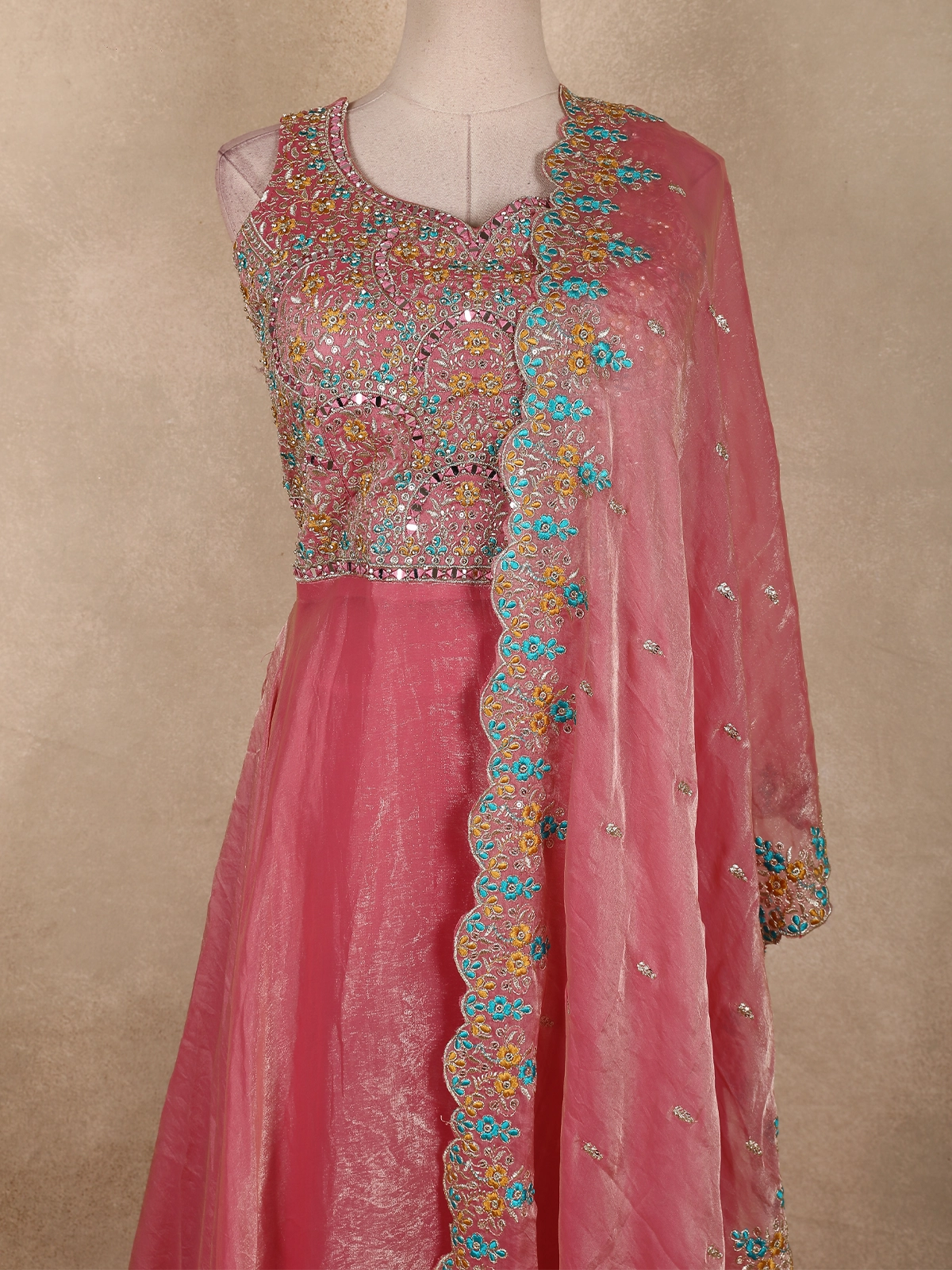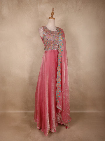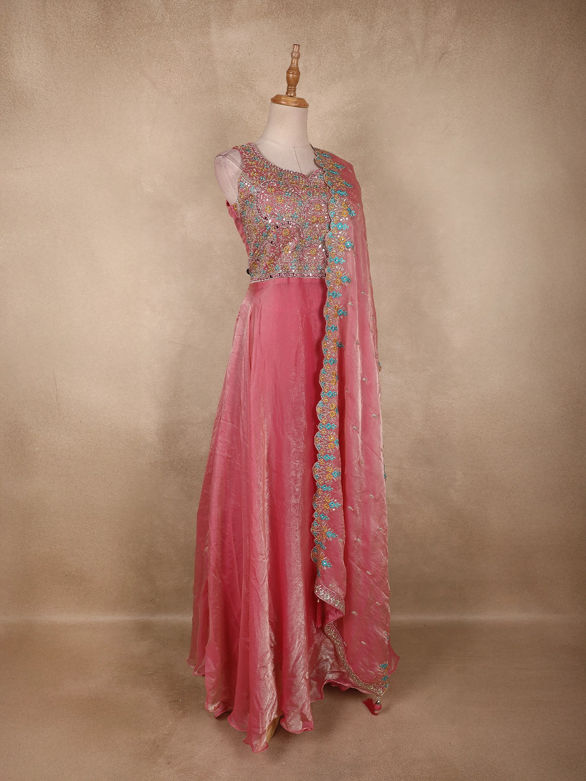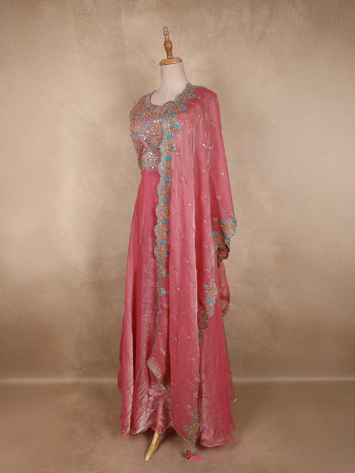 Dusty Rose Pink Floral Thread Embroidery Design Space Silk Party Wear Gown
