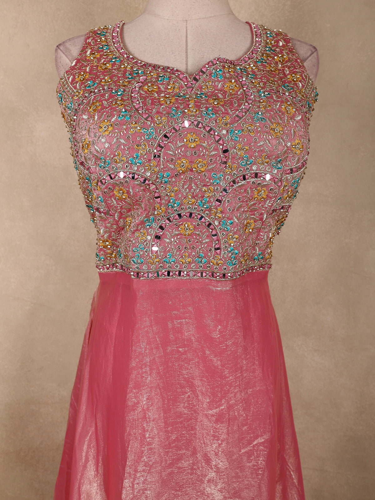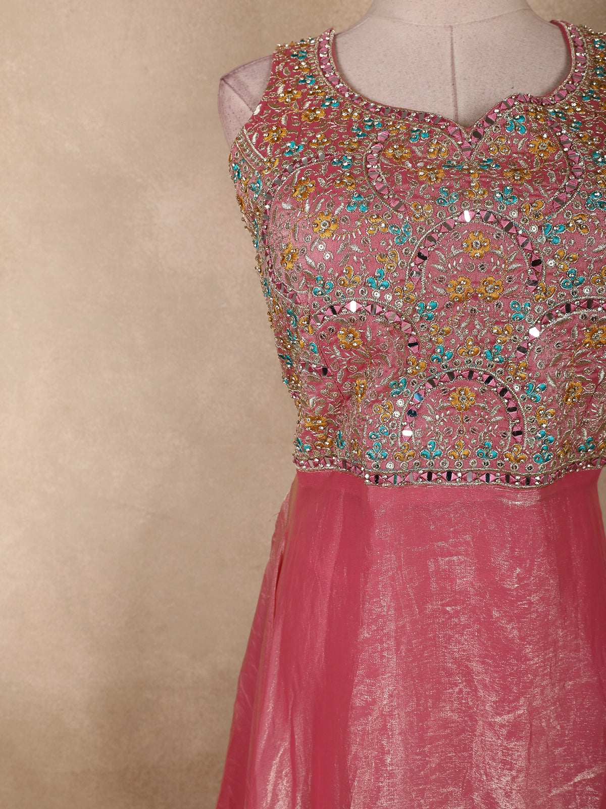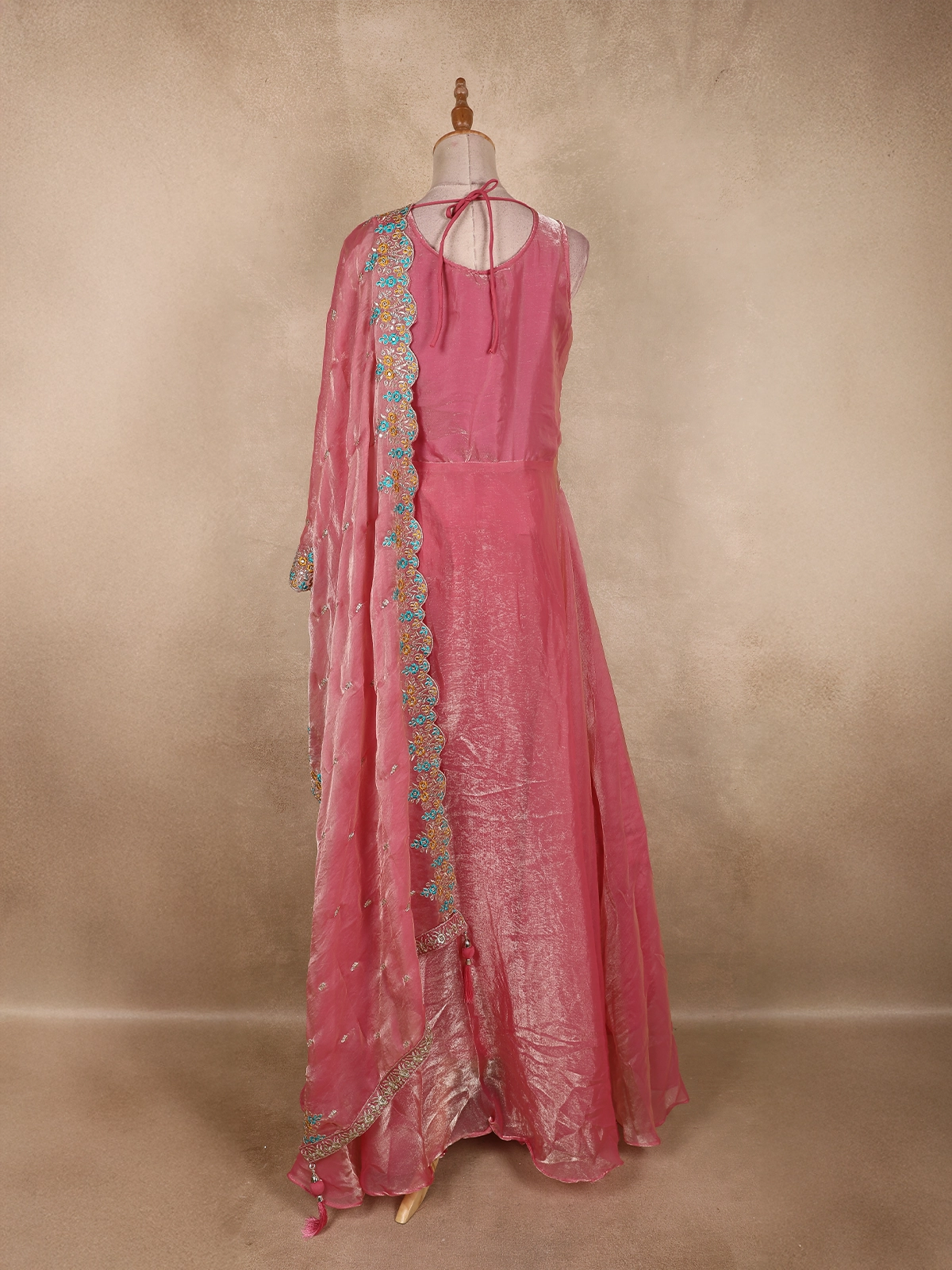 Dusty Rose Pink Floral Thread Embroidery Design Space Silk Party Wear Gown