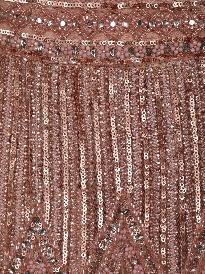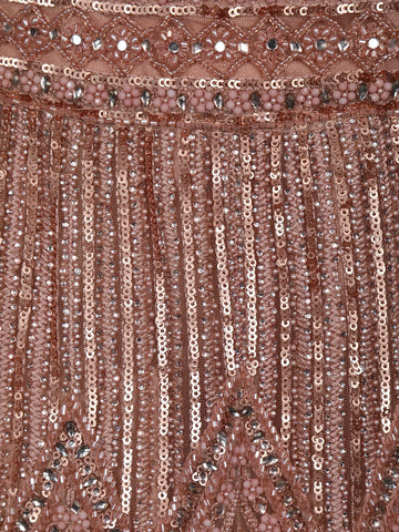 Radiate unmatched elegance in this Dusty Rose Pink Geometric Sequins Embroidered Lehenga Set, an ensemble that perfectly merges contemporary allure with timeless sophistication. The lehenga is adorned with intricate geometric patterns rendered in shimmering sequins and delicate beads, creating a luxurious play of texture and light.