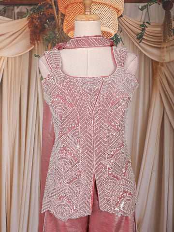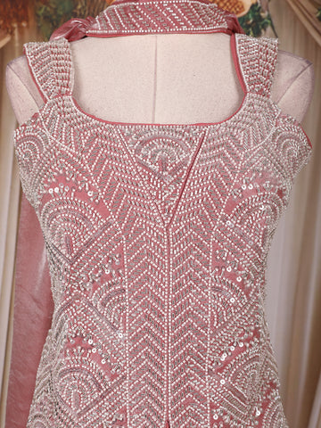 Dusty Rose Pink Sequins Design Organza Palazzo Suit with Choker Dupatta