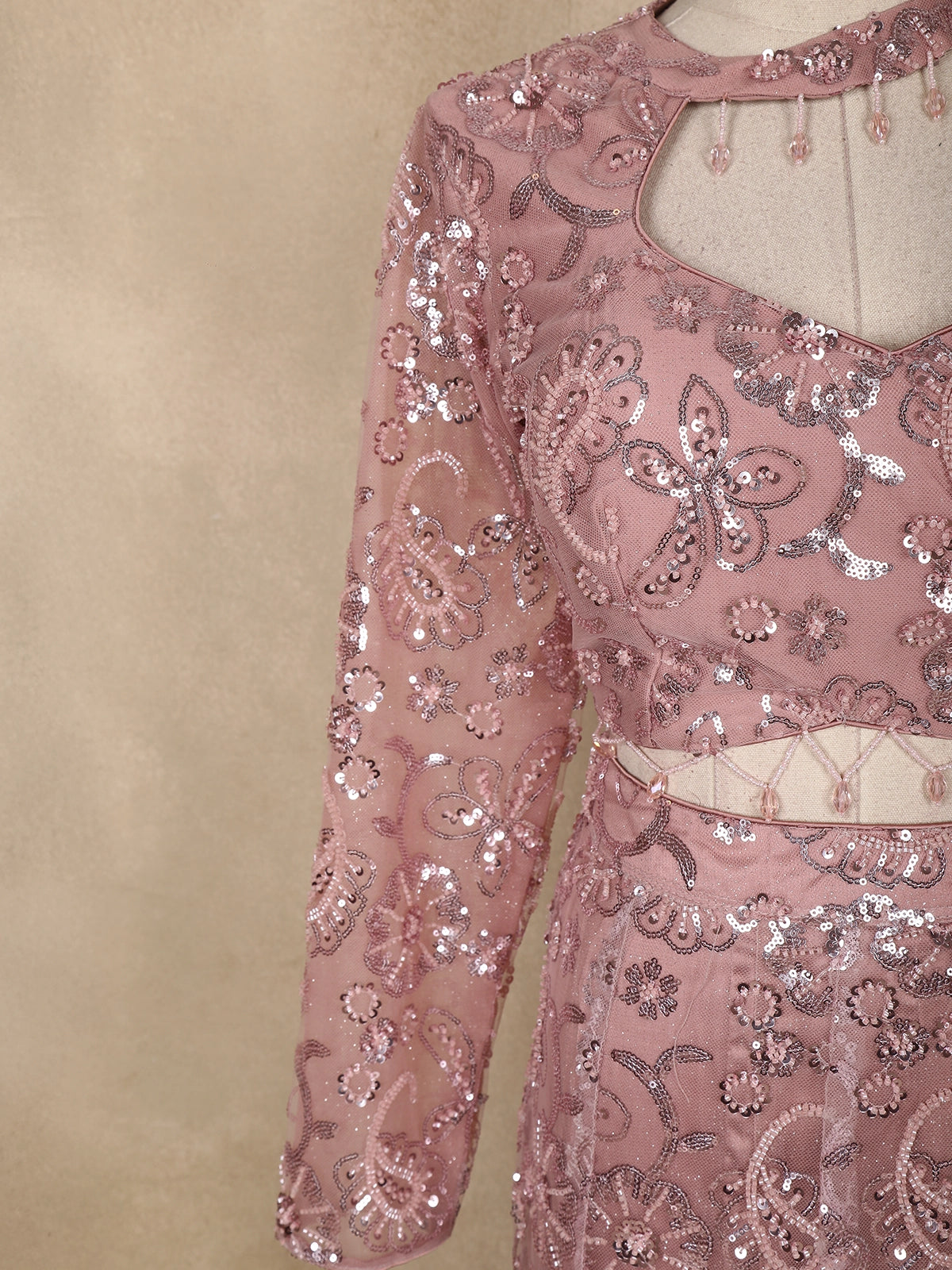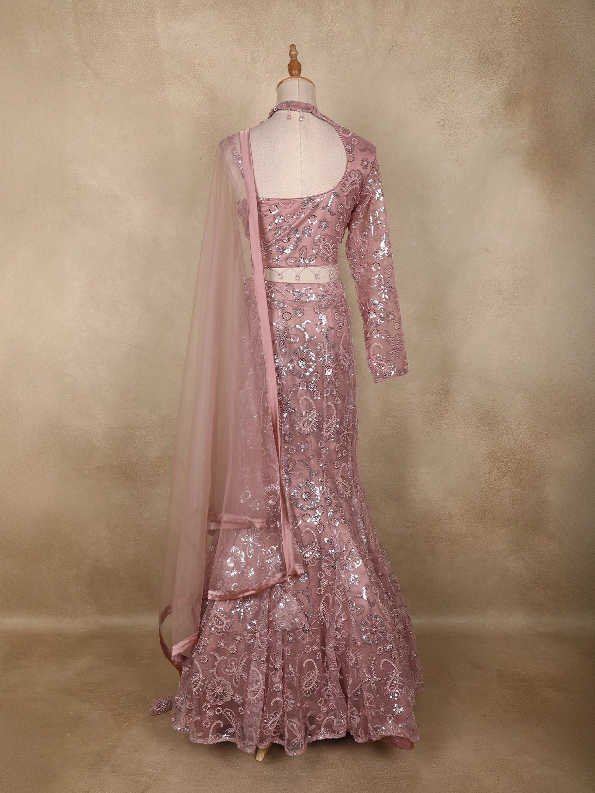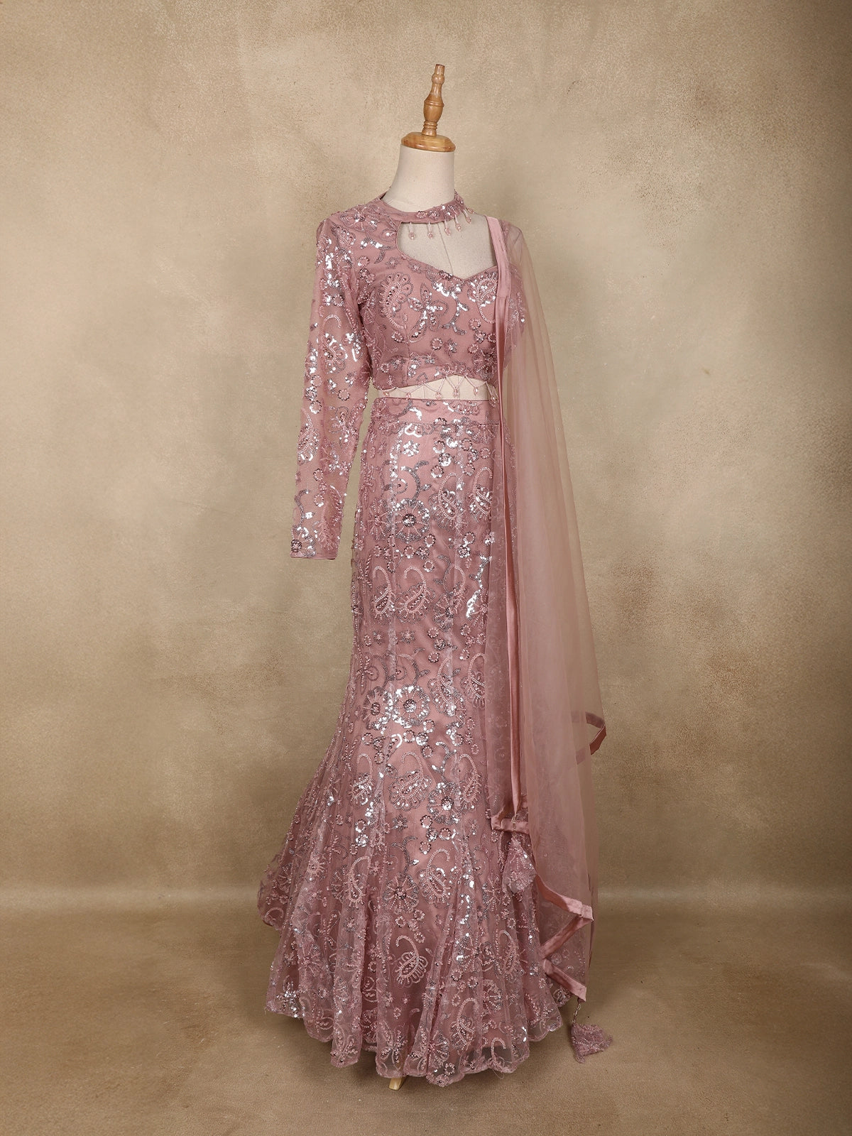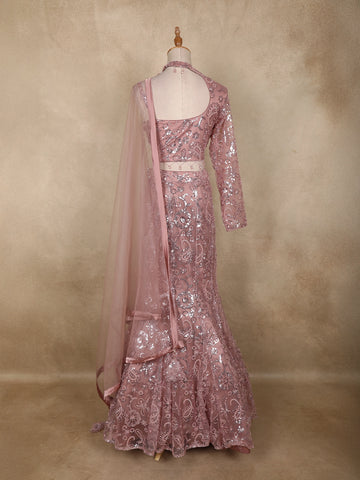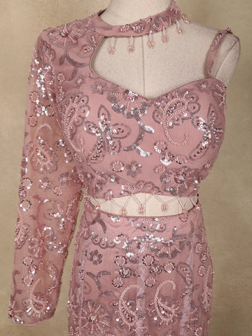 Dusty Rose Sequins Embroidered Net Mermaid Lehenga Set with One-Sleeve Choker Blouse