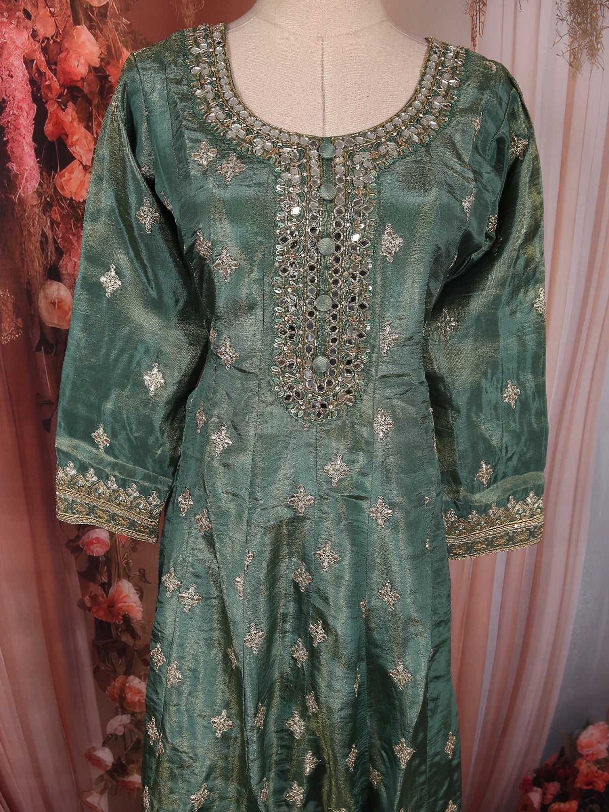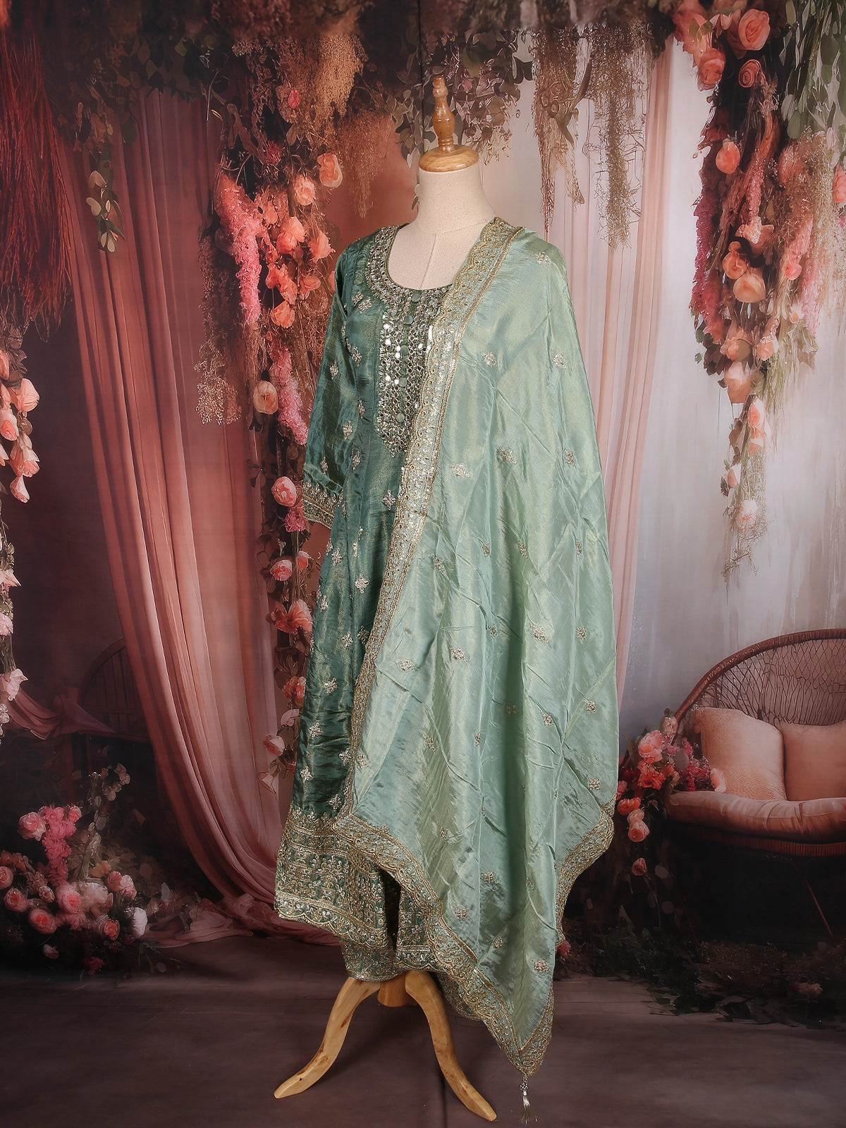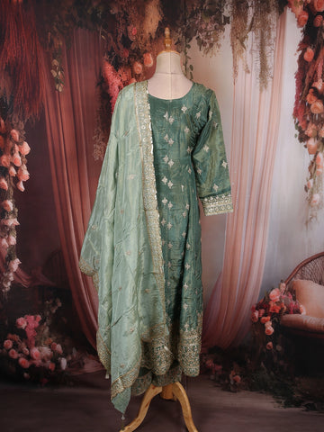 Dusty Sage Green Floral Zari and Mirror Embroidered Design Tissue Organza Salwar Suit