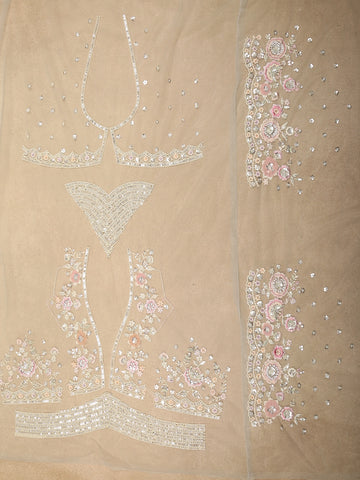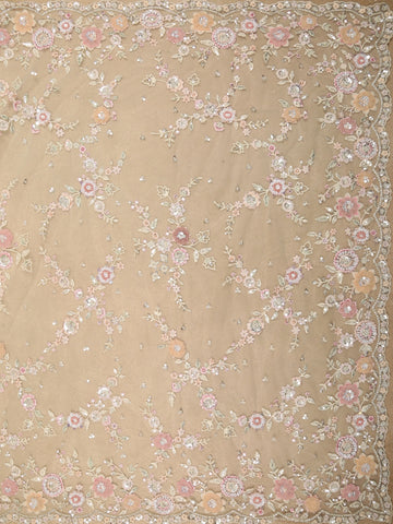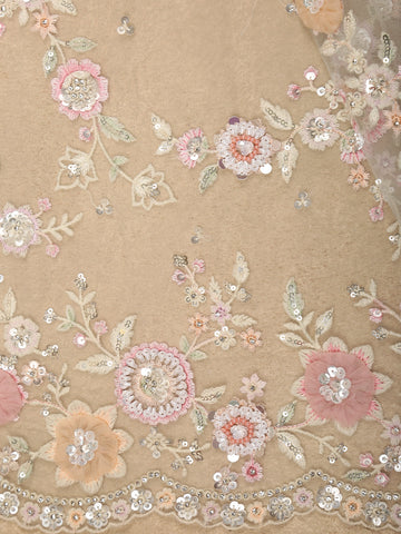 Crafted on a lightweight sheer net fabric, the saree is lavishly adorned with floral sequins and beads embroidery that forms elegant blooming motifs across the drape. These delicate embellishments shimmer subtly, creating a refined sparkle that enhances the saree’s ethereal beauty. The intricate floral vine patterns flow gracefully along the body, adding depth and richness to the overall design.