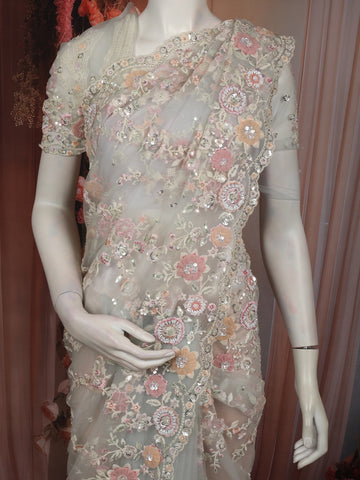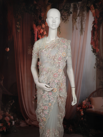 Paired with a matching embroidered blouse, this designer saree creates a harmonious and elegant silhouette. Perfect for bridesmaids, festive evenings, and grand occasions, this piece blends soft pastel romance with intricate craftsmanship, making it a timeless addition to any couture-inspired wardrobe.