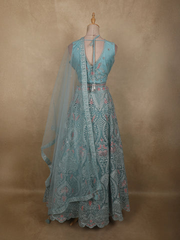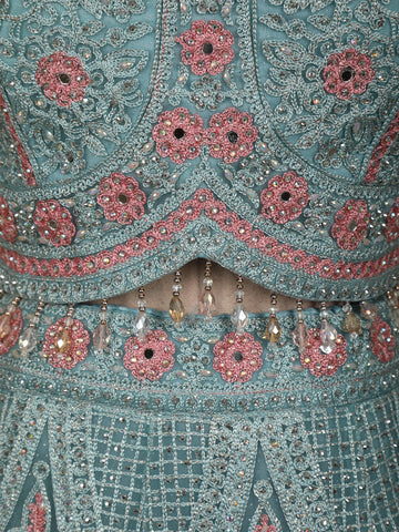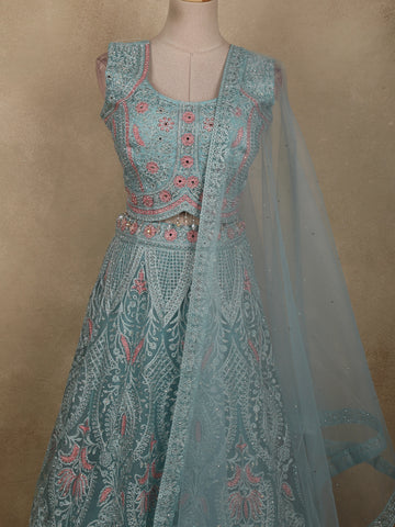 Dusty Teal Blue Floral Thread and Beads Embroidered Design Net Lehenga With Net Dupatta