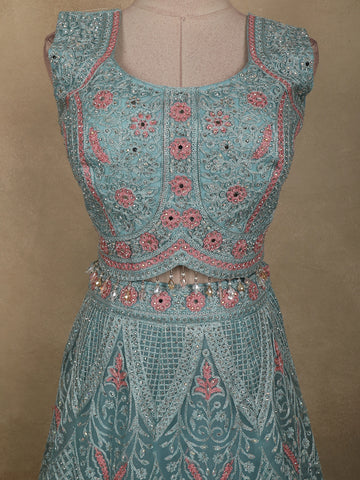 Graceful and intricately detailed, this Dusty Teal Blue Net Lehenga Set is a beautiful blend of traditional artistry and contemporary elegance. Designed to create a statement at grand celebrations, the ensemble features delicate floral thread embroidery enhanced with beads, stones, and subtle mirror accents, adding a refined sparkle that perfectly complements the soothing teal tone.