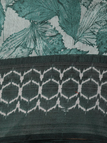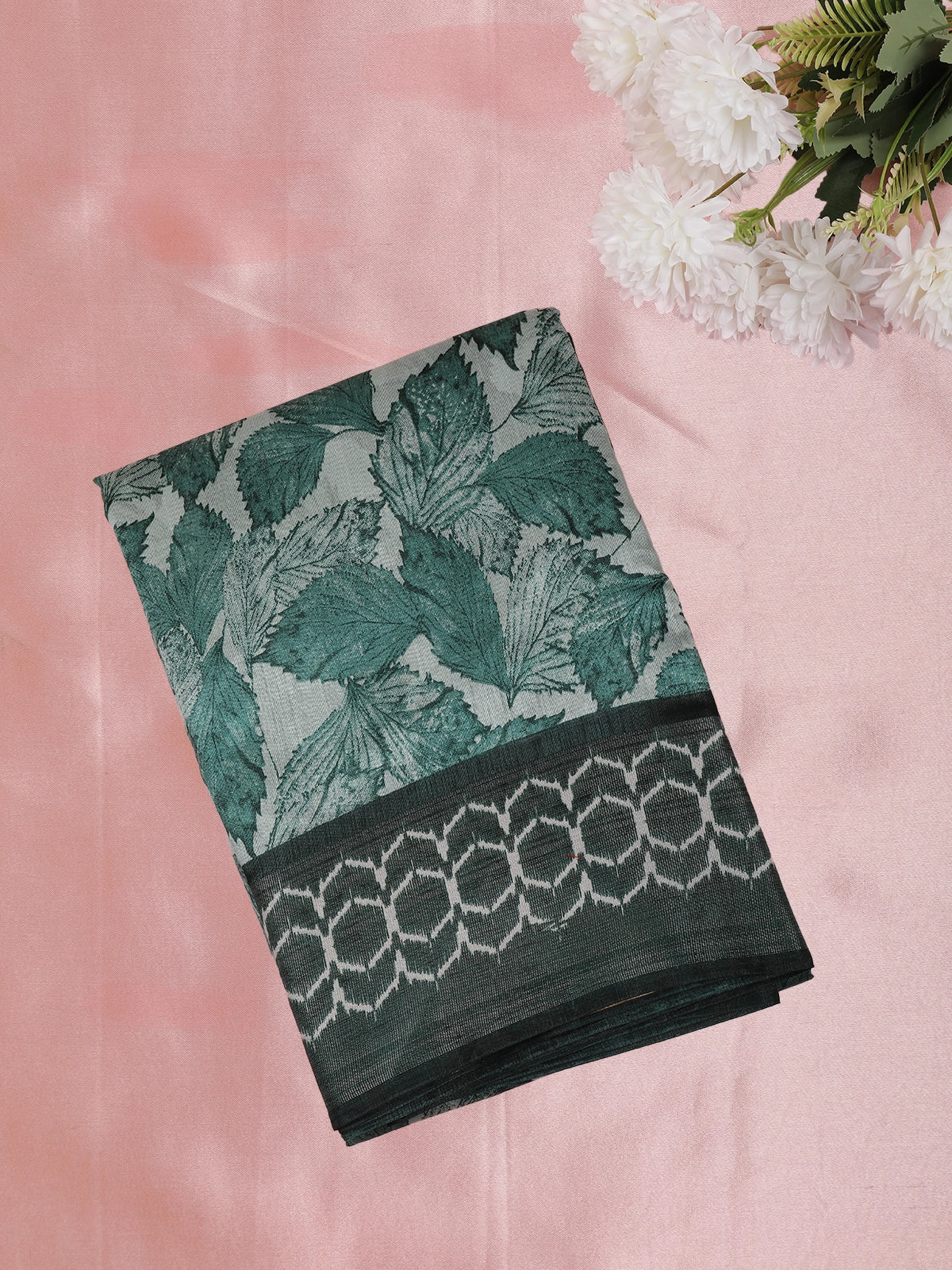 Dusty Teal Green Leaf Printed Design Mixed Cotton Saree