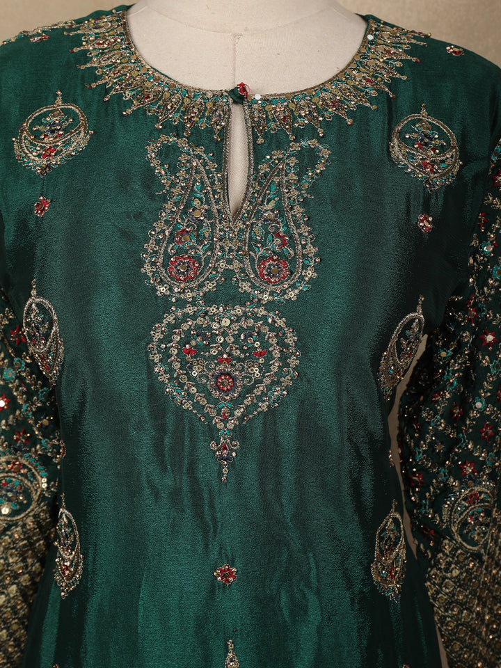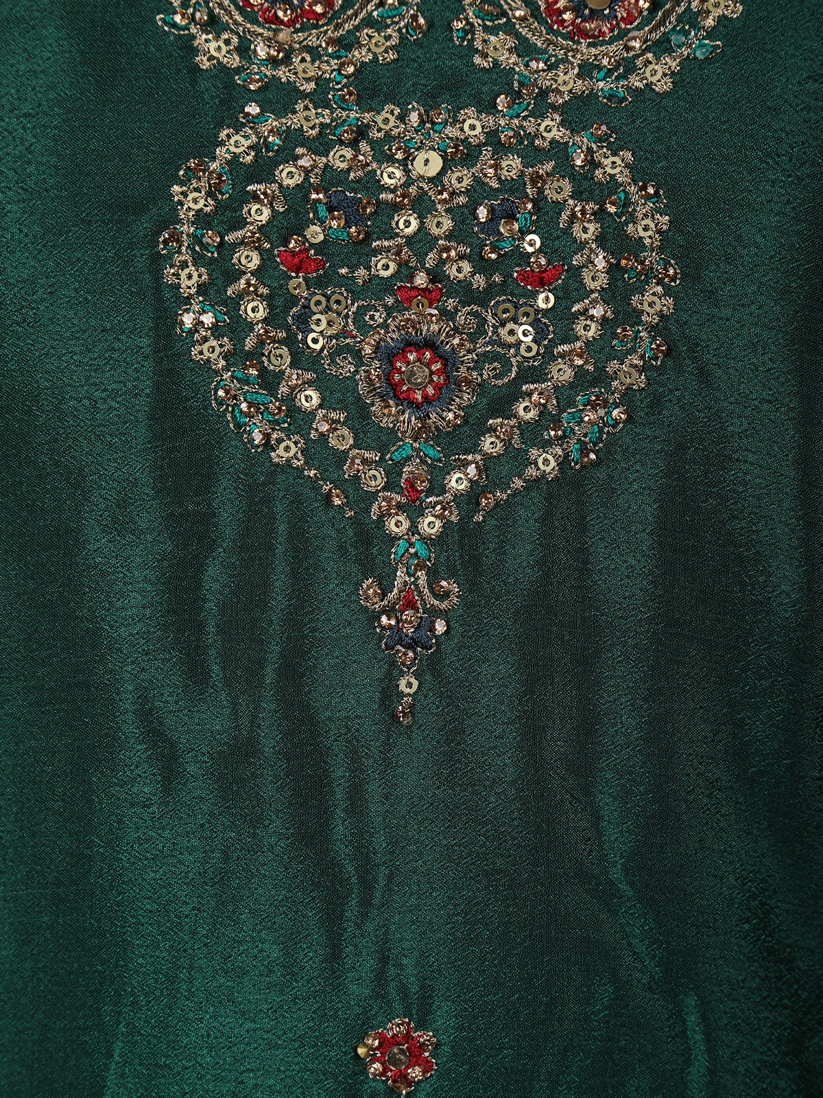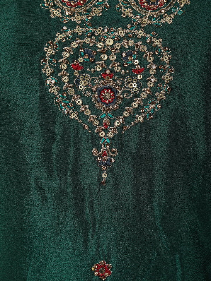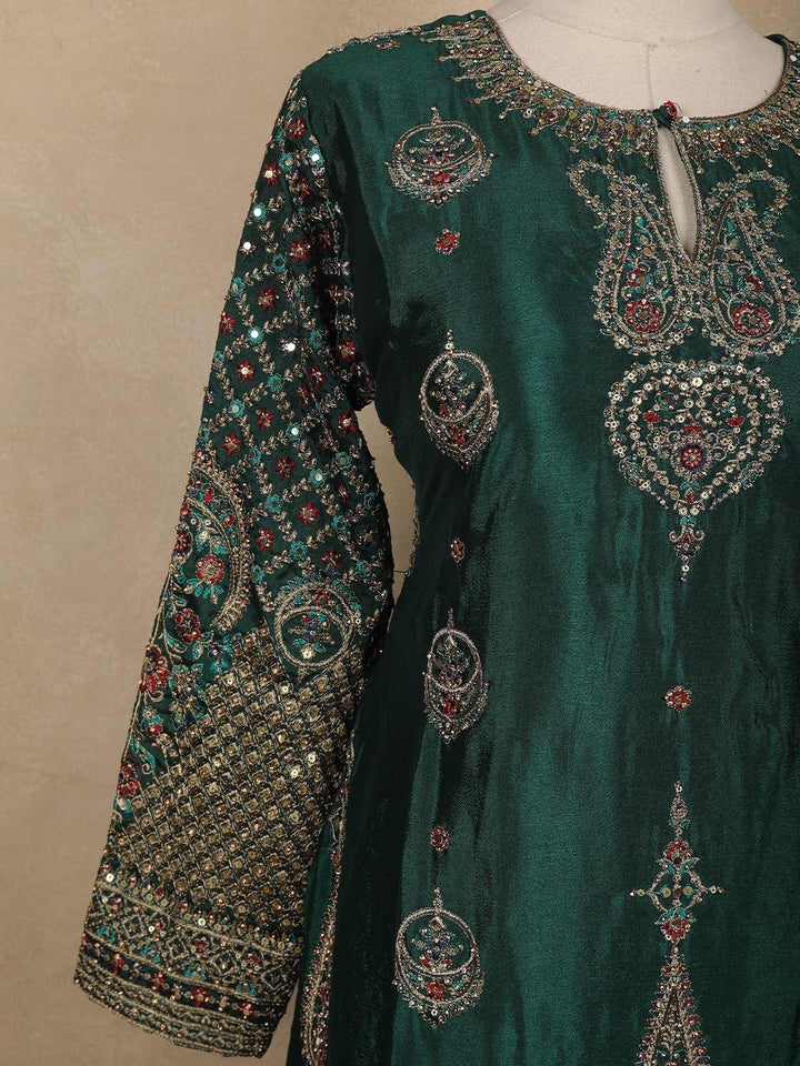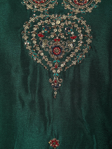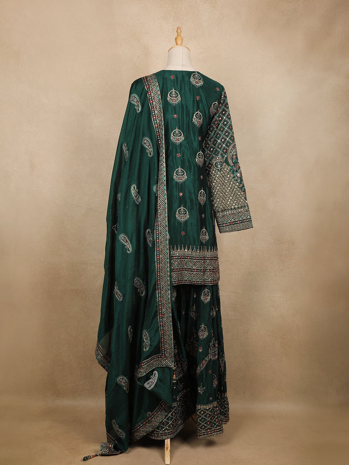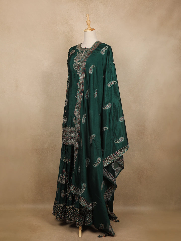 Step into regal elegance with this Emerald Green Silk Palazzo Suit, an ode to classic paisley artistry and intricate craftsmanship. The rich silk fabric gleams with zari, sequin, and bead embroidery, forming timeless motifs that radiate festive grandeur.
