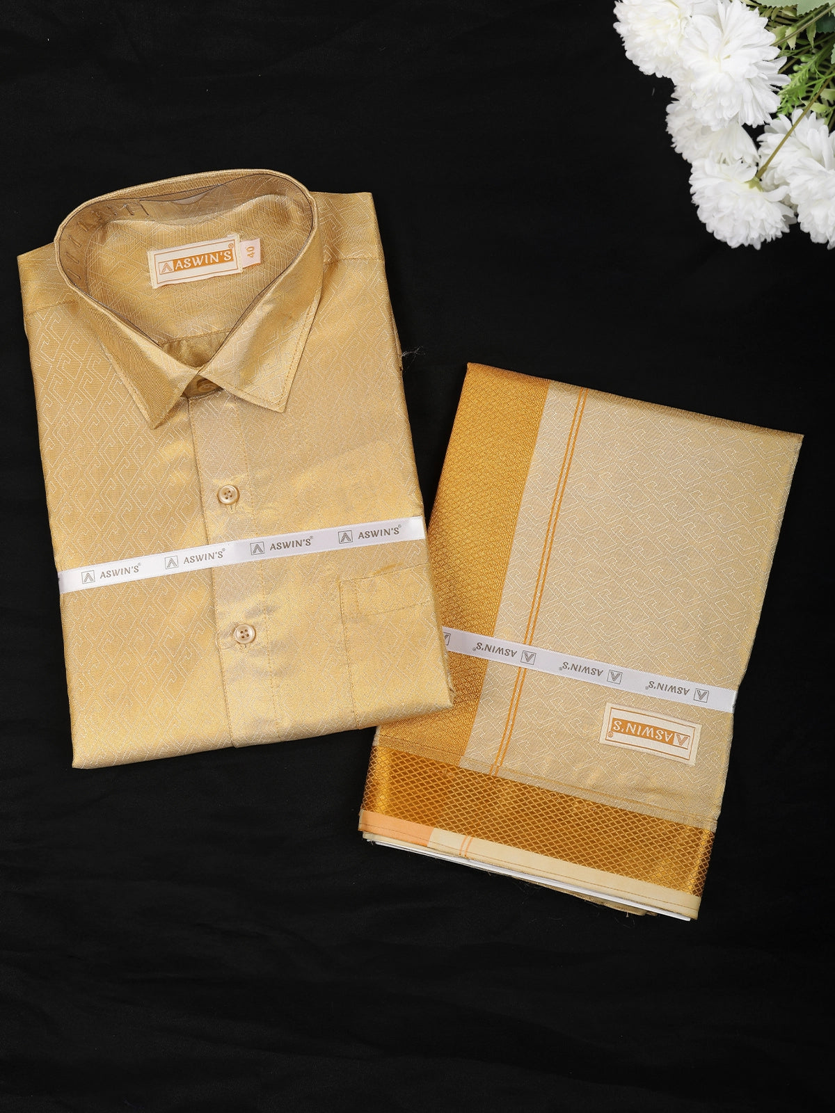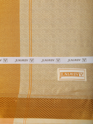 The matching dhoti completes the ensemble with its coordinated cream base and graceful gold-woven stripes along the border, creating a perfectly harmonized traditional outfit. Designed with a smooth finish and premium texture, it adds a polished touch to your cultural attire.