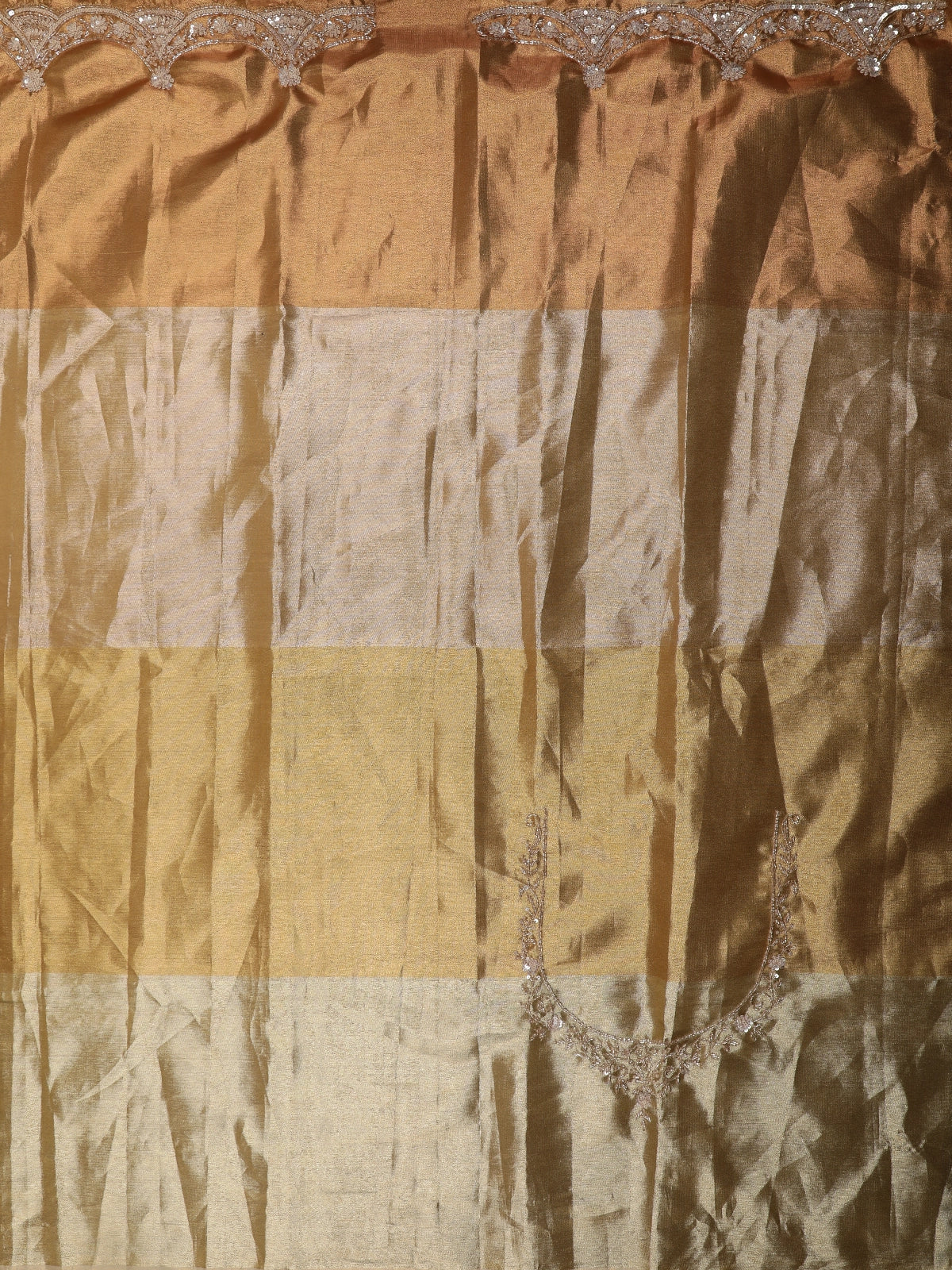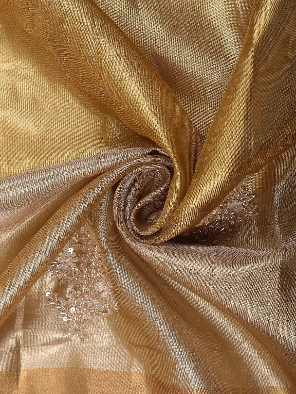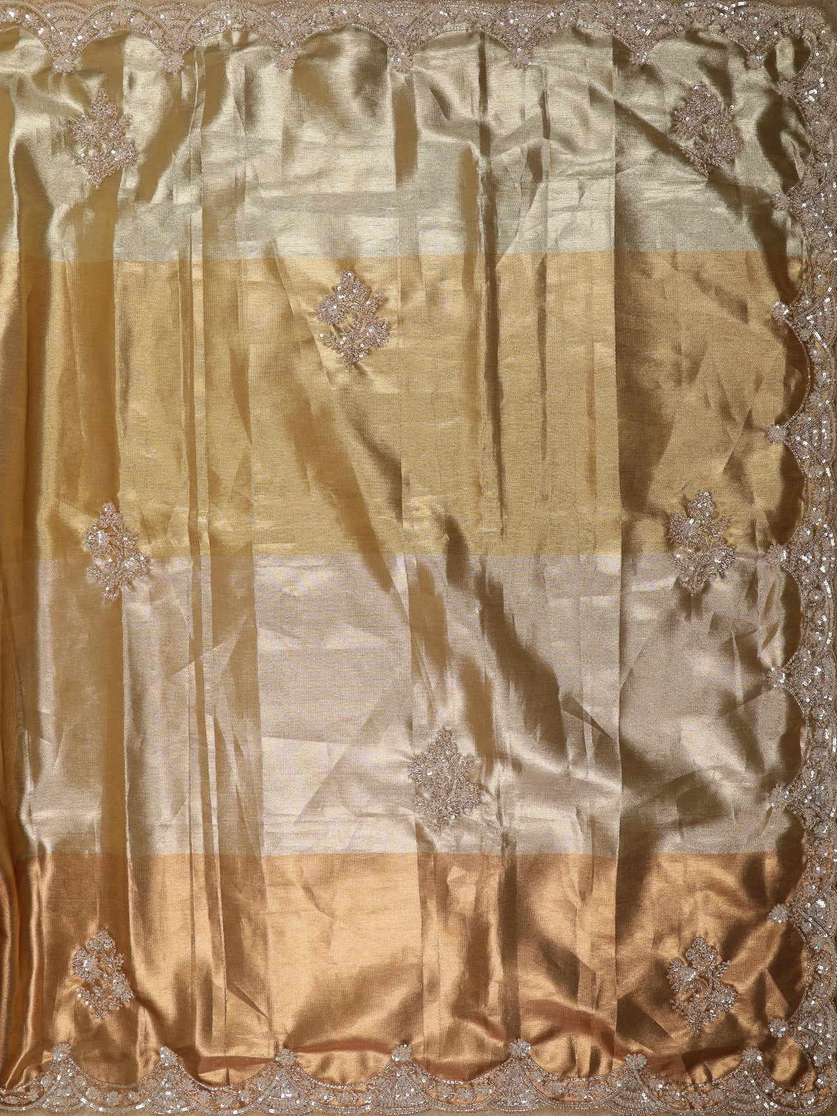 Gold and Olive Shaded Sequins Embroidered Tissue Silk Saree with Scalloped Border