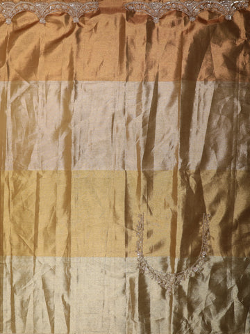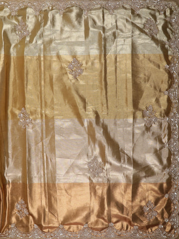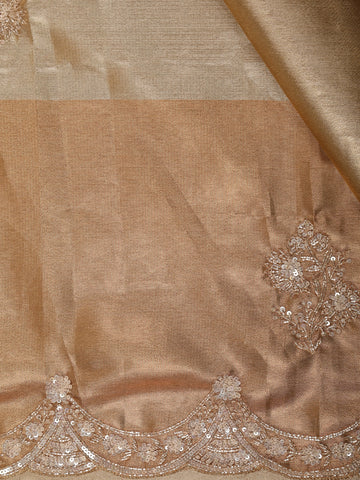 Exuding refined elegance, this exquisite Tissue Silk saree features a graceful blend of gold and olive tones arranged in soft shaded panels that create a luminous, festive appeal. The saree is beautifully enhanced with delicate sequin and thread embroidery motifs scattered across the body, adding subtle sparkle without overpowering the design.