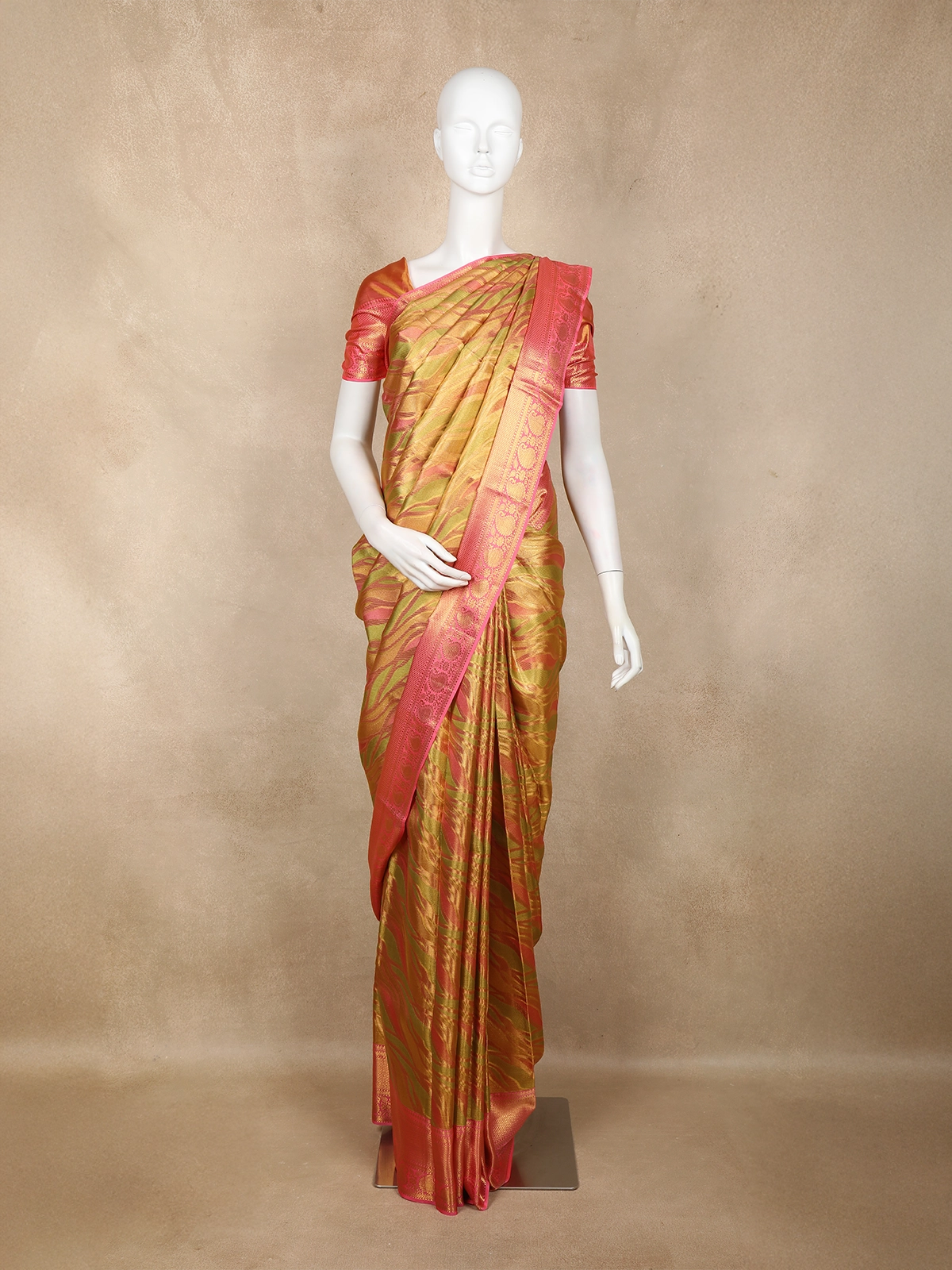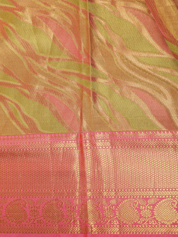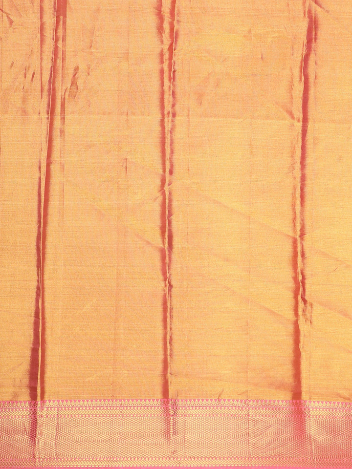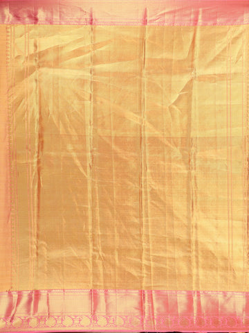 The luxurious gold silk base emits a radiant sheen, enhancing every drape and fold with a touch of regality. The contrast pink zari woven border, adorned with intricate motifs, adds a rich festive finish—perfect for grand celebrations and cultural occasions.