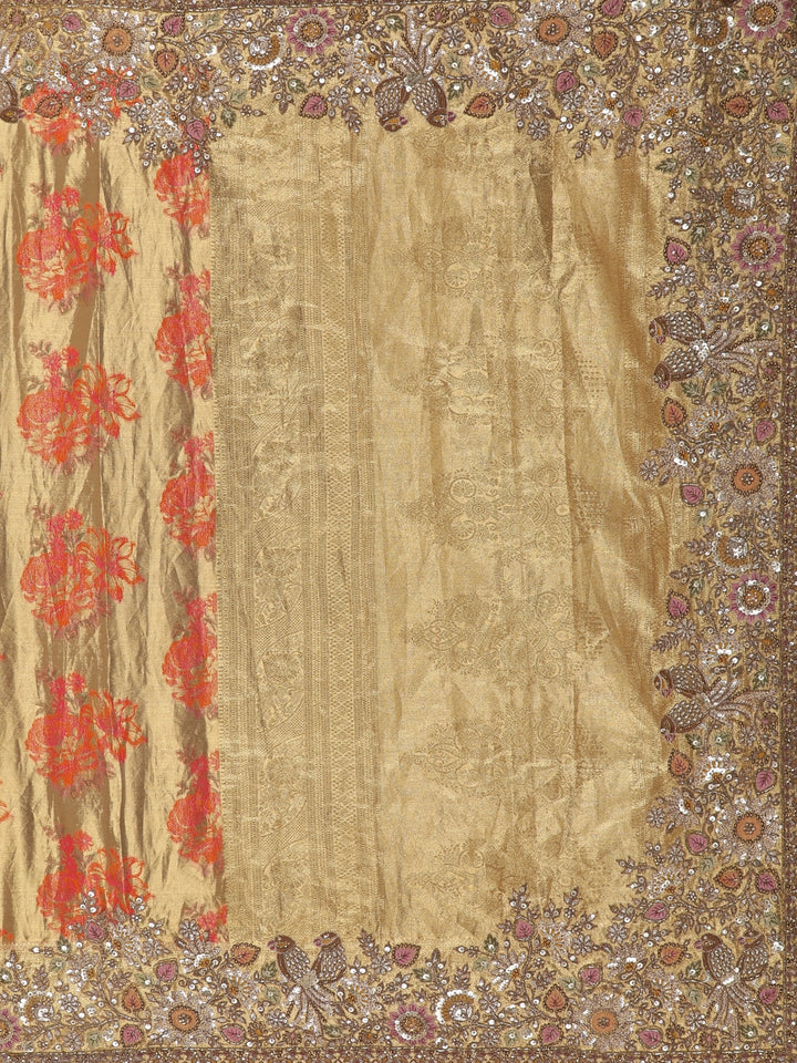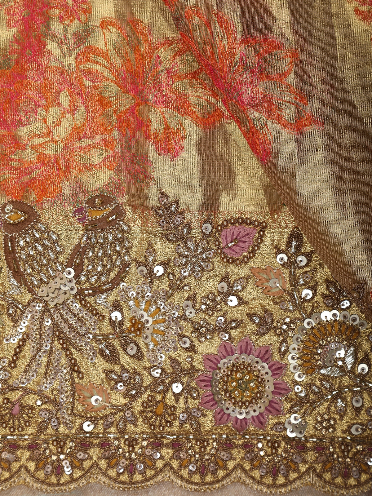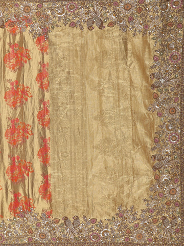 Elevate your festive and bridal wardrobe with this breathtaking Gold Floral Woven Tissue Banarasi Saree, crafted to embody luxury and timeless beauty. The shimmering tissue silk base features exquisite floral woven motifs in vibrant orange, adding a striking contrast and a graceful pop of color against the golden sheen. The highlight of this masterpiece is its heavy designer border, adorned with intricate thread embroidery, shimmering sequins, beads, zari accents and delicate floral detailing—giving the saree a truly regal and handcrafted appeal.