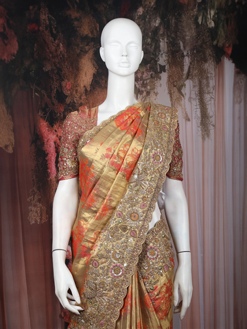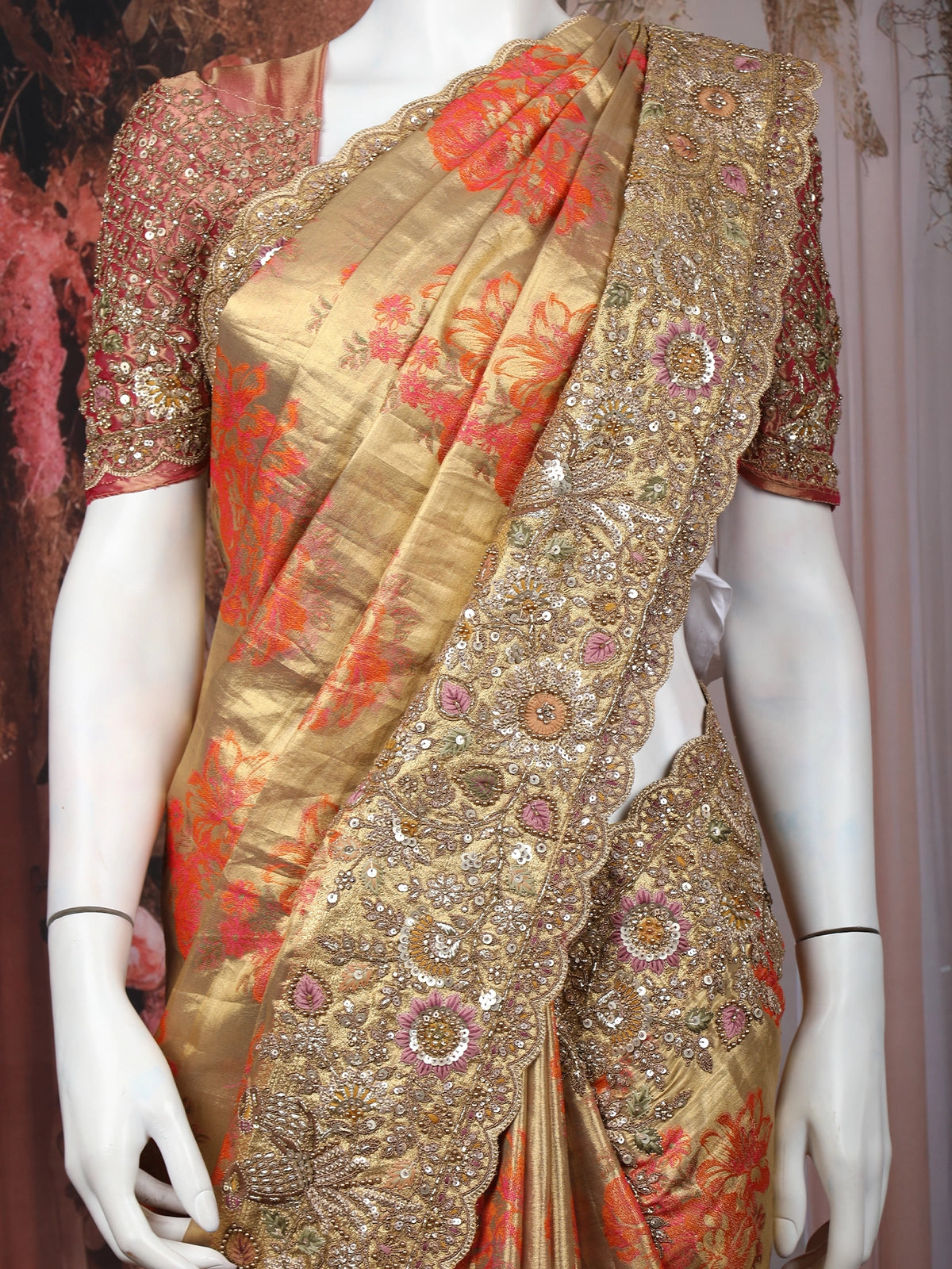 The saree is paired with a contrast orange blouse, designed to complement the floral tones in the drape. The blouse material comes richly embellished, creating a cohesive statement look. The matching gold pallu completes the ensemble with elegance, carrying forward the luxurious detailing and enhancing the overall grandeur.