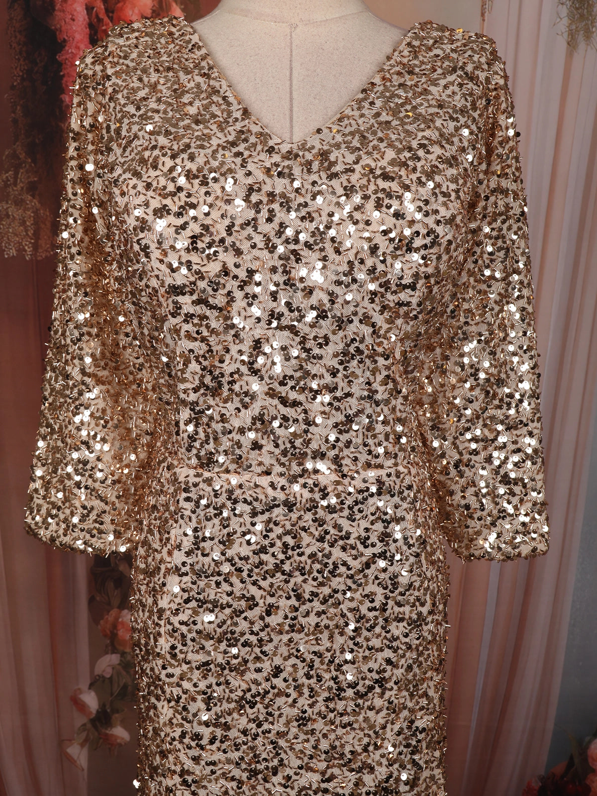 The gown features a classic V-neckline that enhances the neckline with subtle sophistication, while the 3/4 sleeves provide a balanced and graceful silhouette. Designed in a body-hugging fit, it accentuates your curves elegantly before flowing into a soft flare at the hem, ensuring ease of movement and refined charm.