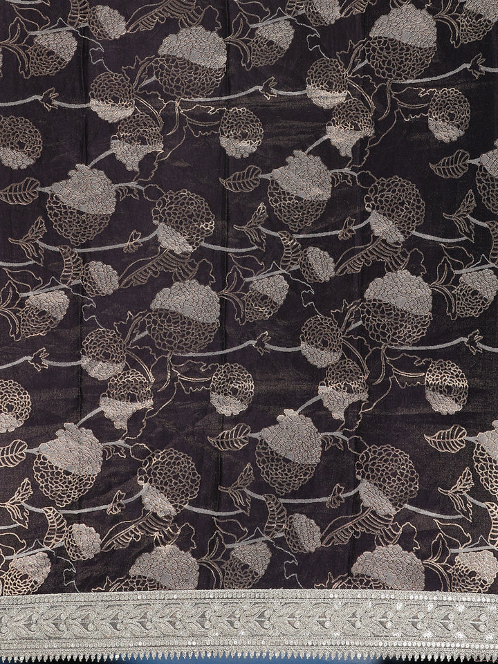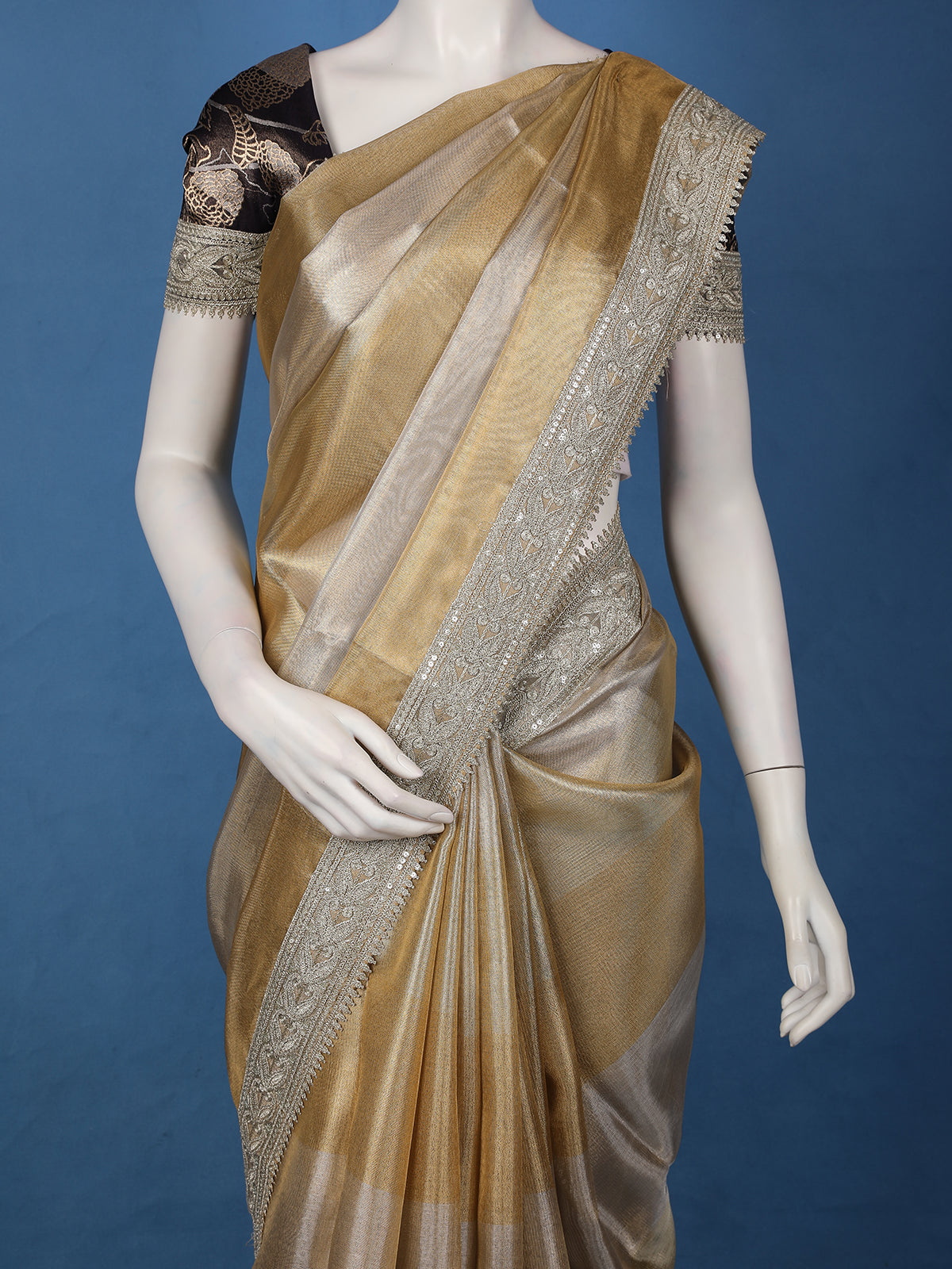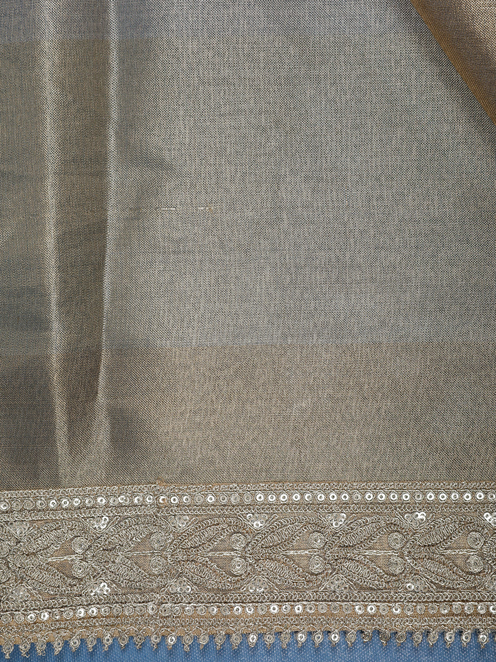 The highlight of this saree is its designer embroidered border, intricately crafted in silver tones, adding a touch of glamour and refinement to the subtle shimmer of tissue fabric. The matching beige pallu enhances the continuity of the design, while the contrast black blouse with rich detailing provides a bold and elegant balance to the overall look.