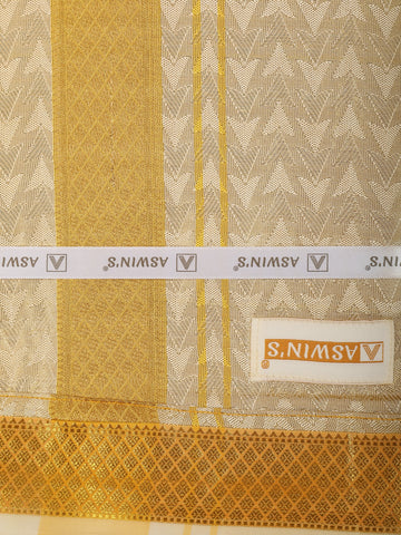 The matching dhoti completes the ensemble with its coordinated cream base and graceful gold-woven stripes along the border, creating a perfectly harmonized traditional outfit. Designed with a smooth finish and premium texture, it adds a polished touch to your cultural attire.