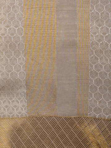 The full-sleeve shirt showcases a classic collared neckline with a soft sheen that complements the intricate woven zari work, exuding understated grandeur. Paired with a matching beige dhoti adorned with a golden zari border, this set captures the perfect balance between cultural charm and modern finesse.