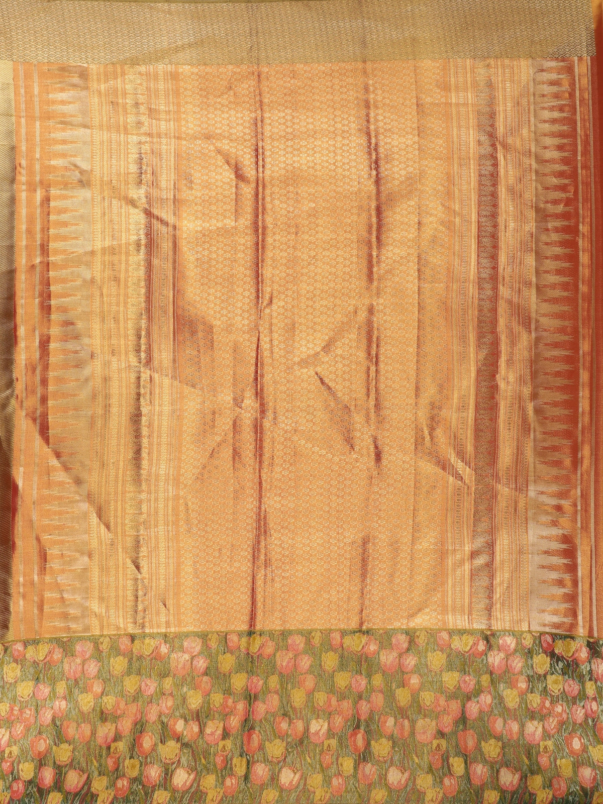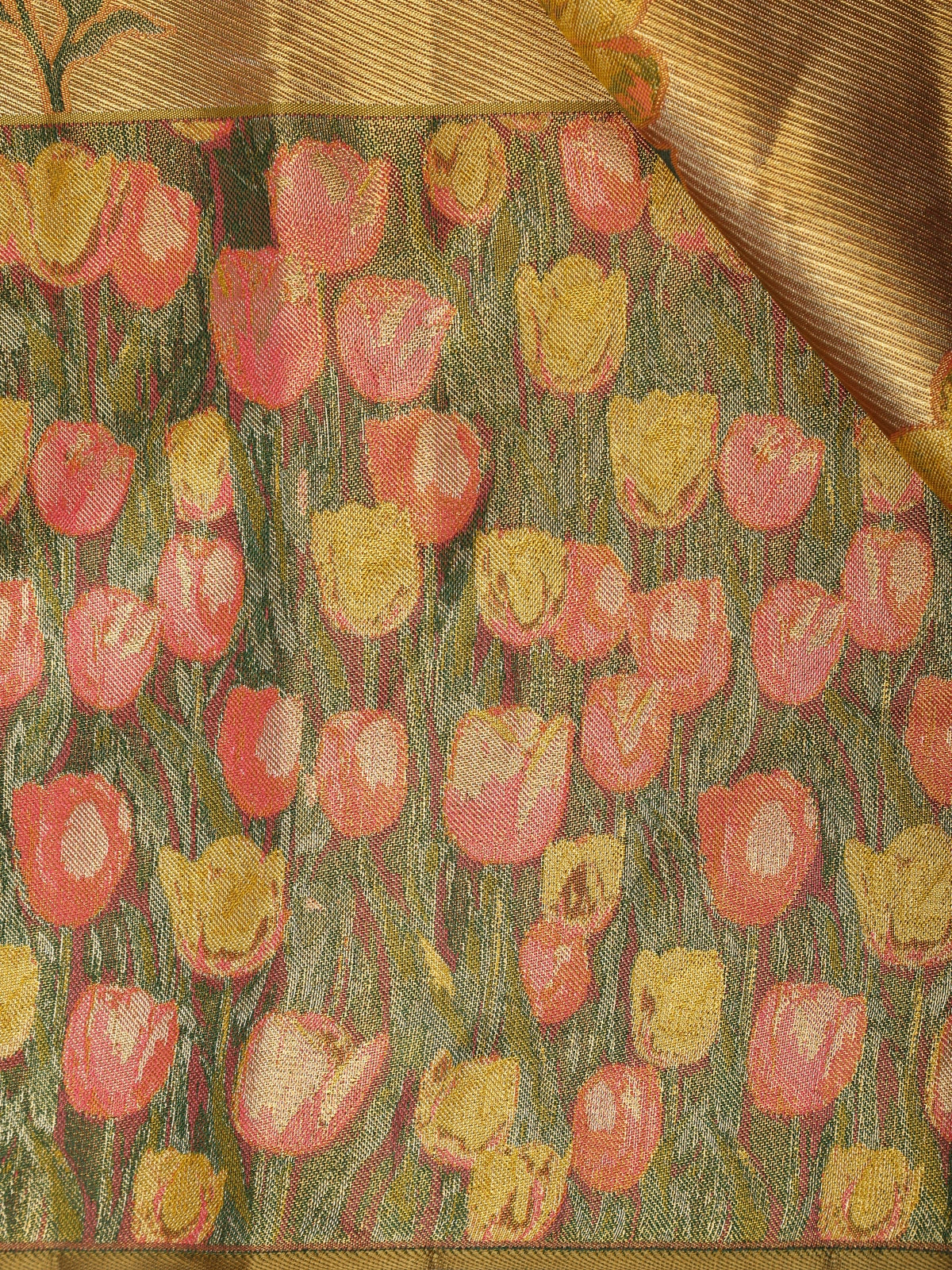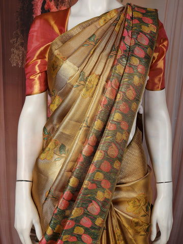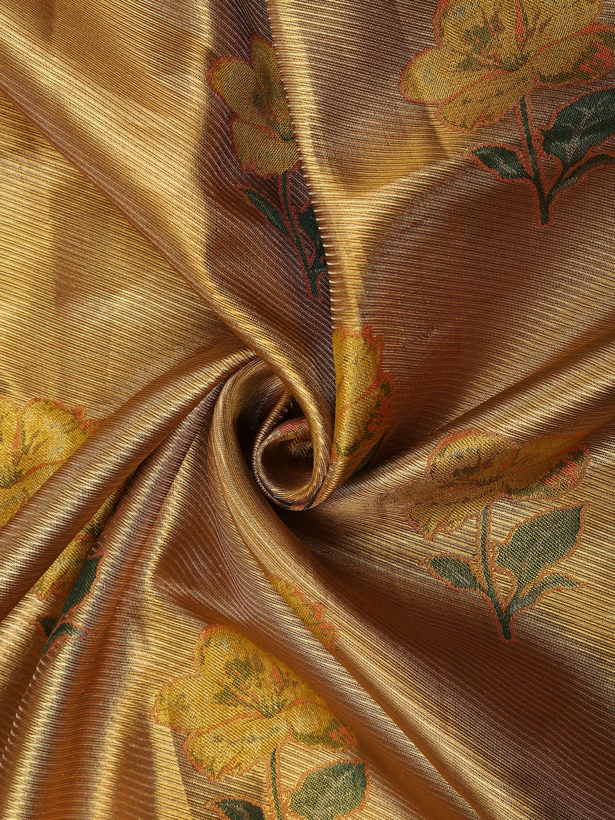 Golden Floral Woven Tissue Silk Saree with Contrast Floral Border