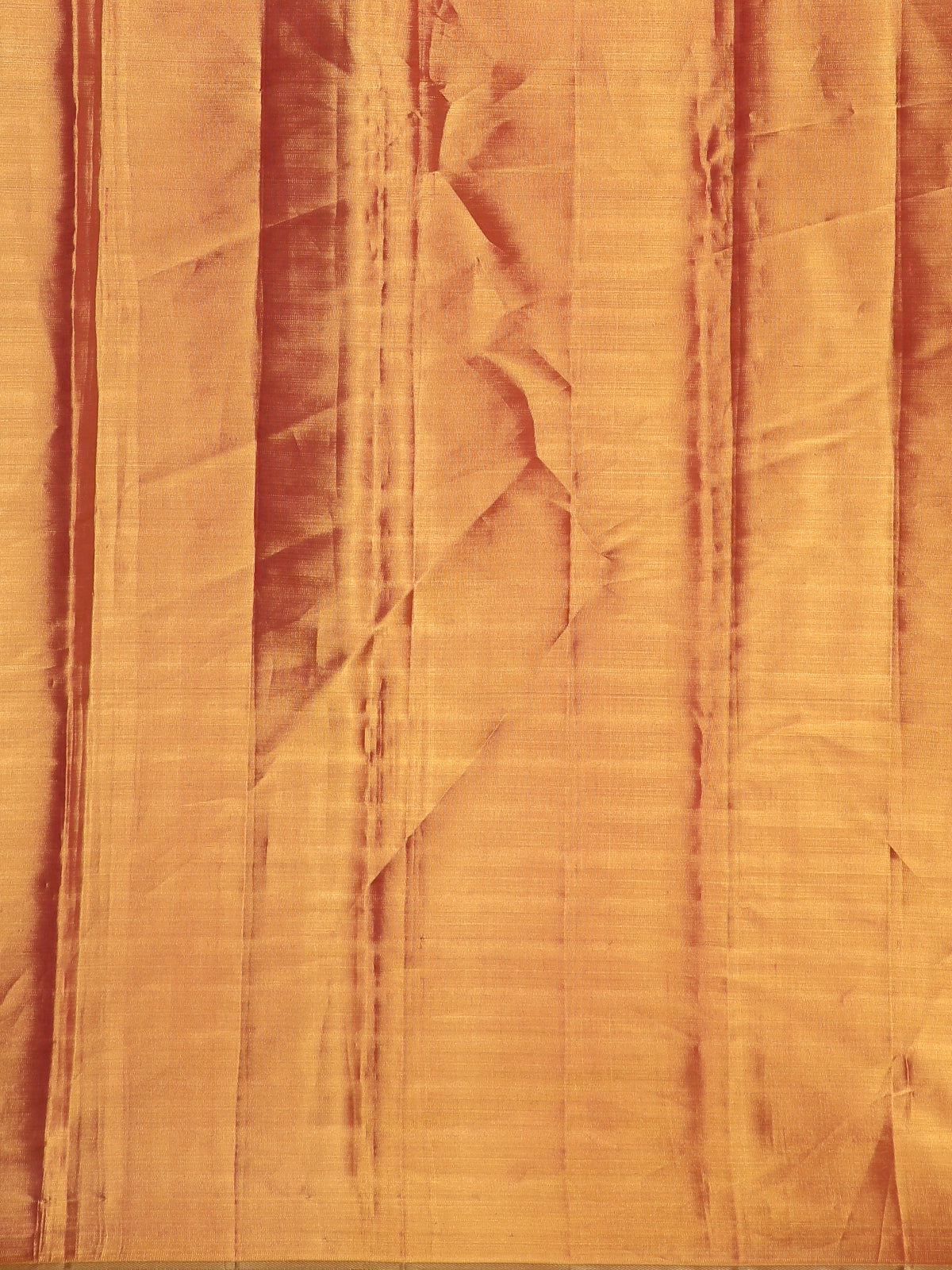 The saree is beautifully framed with a contrast floral woven border in earthy green tones highlighted with soft peach and mustard accents, lending a traditional charm. The zari-woven pallu enhances the richness of the saree, making it perfect for festive and ceremonial wear. Paired with a contrast rust-red blouse with a golden glow, this saree delivers a striking and timeless appeal.