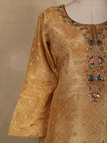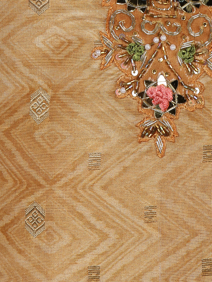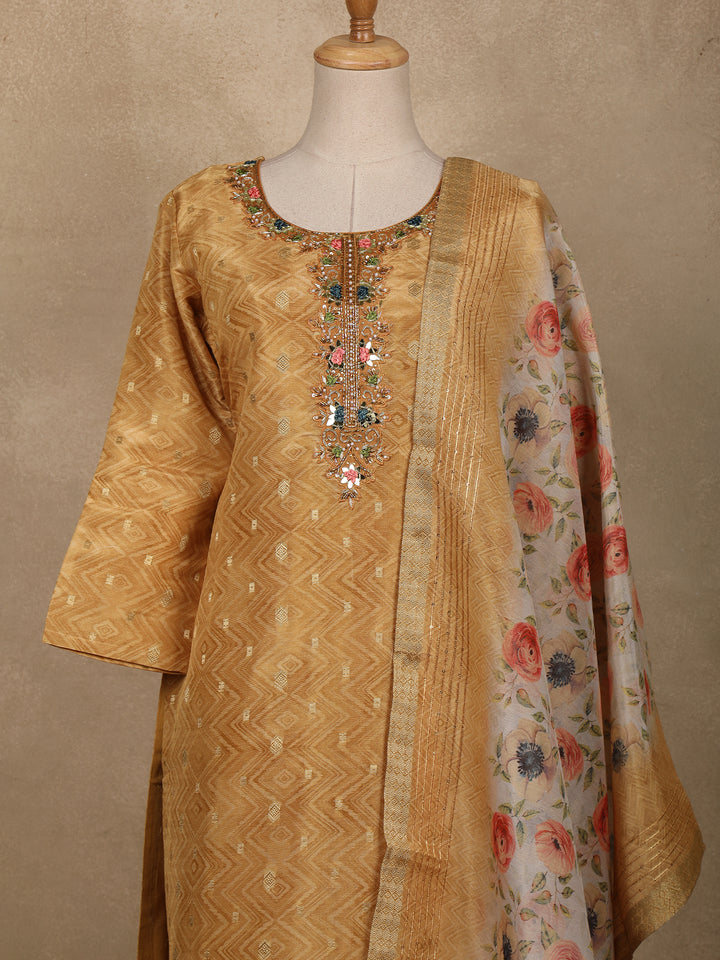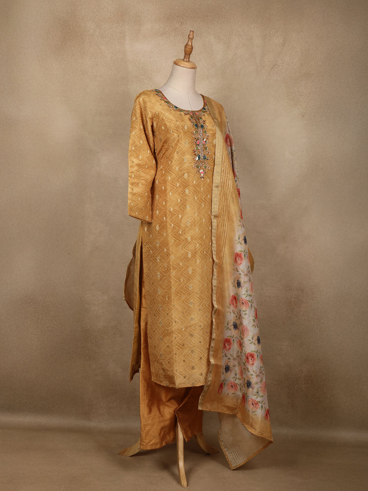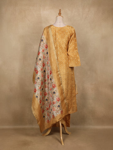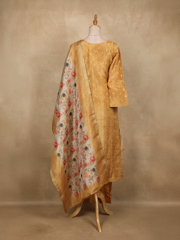 Golden Geometric Woven Tussar Silk Salwar Suit With Floral Dupatta