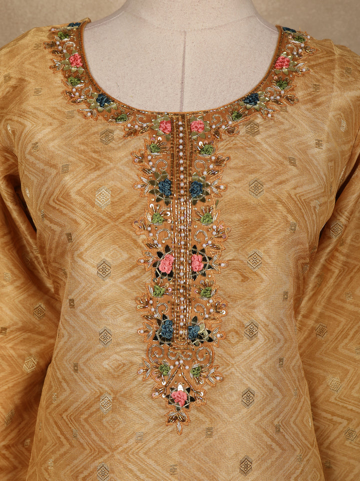 Elevate your ethnic elegance with this Golden Tussar Silk Salwar Suit, exquisitely woven in geometric patterns and detailed with delicate thread, bead, and mirror embroidery along the neckline. The subtle golden sheen of the fabric exudes timeless grace, while the floral printed organza dupatta adds a soft romantic touch. Perfect for festive gatherings, traditional functions, or elegant celebrations, this ensemble embodies the harmony of heritage and sophistication.