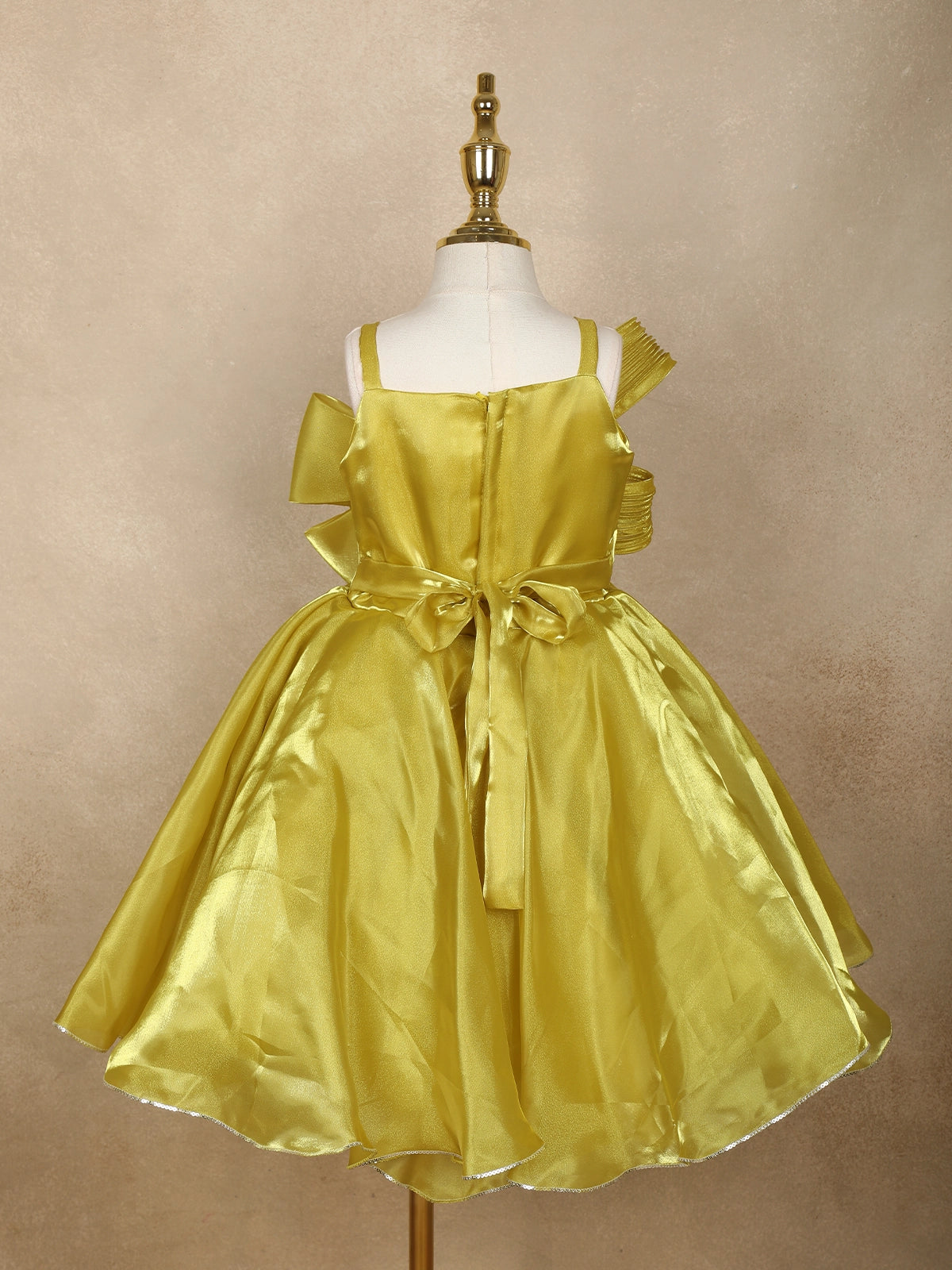 Make every celebration more magical with this stunning golden satin party frock designed for your little princess. The eye-catching oversized 3D flower with a sparkling crystal centerpiece adds a luxurious and playful charm. Crafted in a glossy satin fabric, the voluminous flare ensures a graceful twirl effect that’s perfect for birthdays, weddings and special festive occasions.