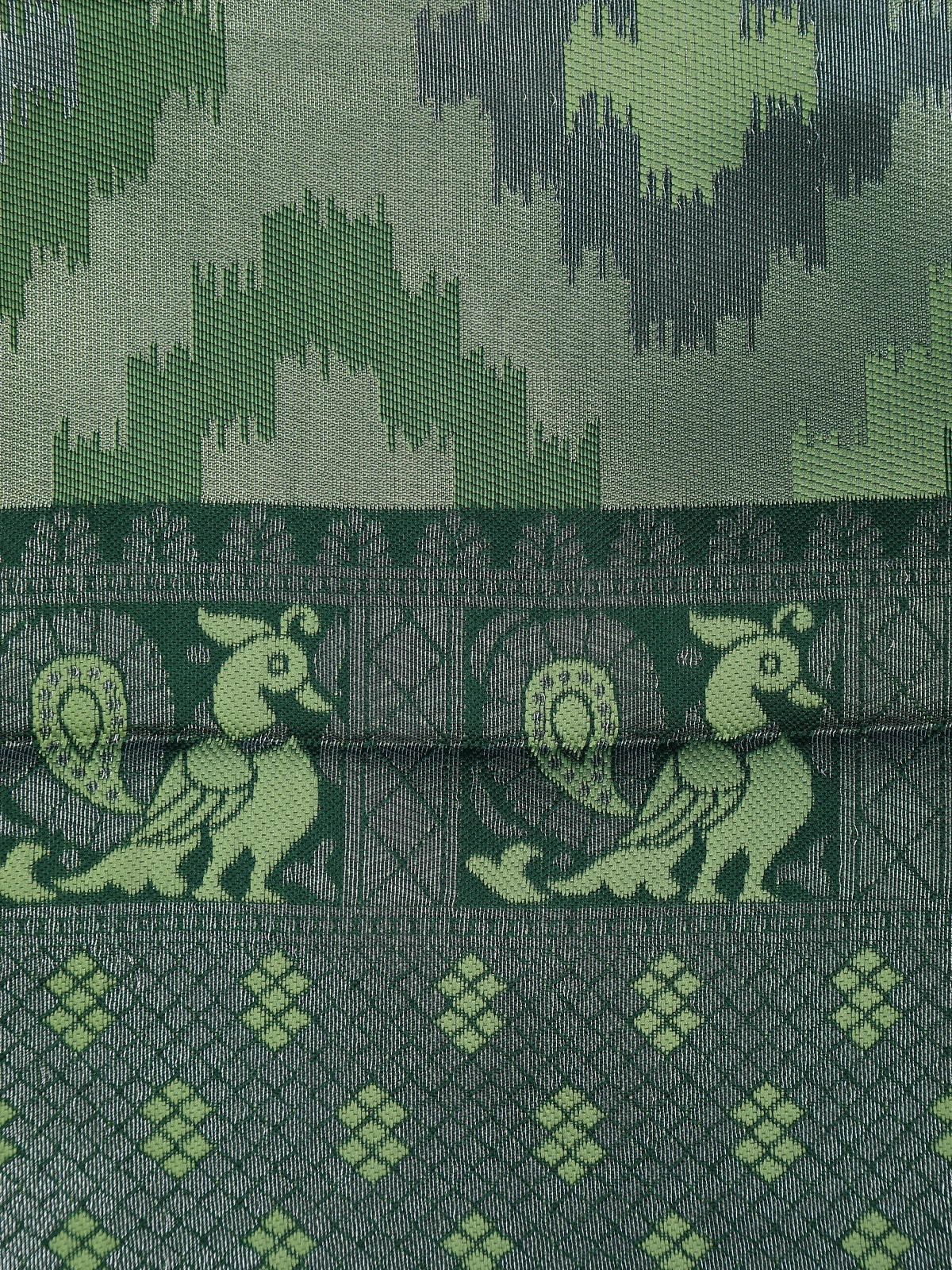 Green And Grey Ikat Design Art Silk Saree with Contrast Dark Green Embroidered Blouse
