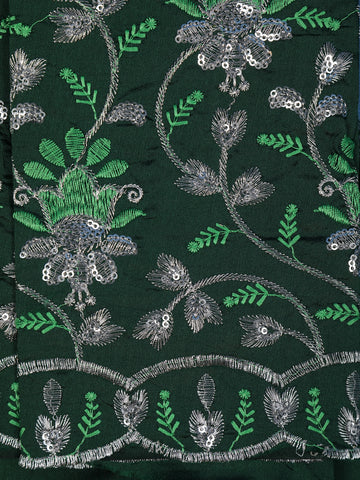 The saree is paired with a contrast dark green embroidered blouse, embellished with silver and green floral threadwork and sequin detailing, enhancing its festive elegance. Perfect for weddings, receptions, and celebrations, this saree effortlessly combines timeless tradition with modern sophistication.
