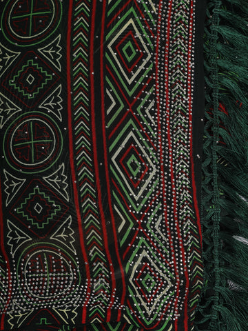 Elevate your ethnic wardrobe with this striking Green and Red Geometric Printed Chiffon Saree, crafted to bring a bold, contemporary twist to traditional patterns. The saree features an eye-catching mix of tribal and geometric motifs, blended beautifully in deep green, red, black, and white tones—making it a perfect choice for festive gatherings, cultural events, or elegant daytime outings.