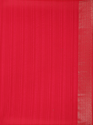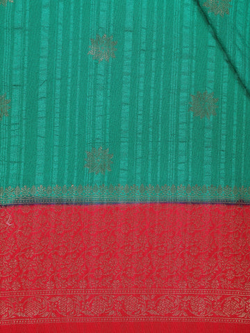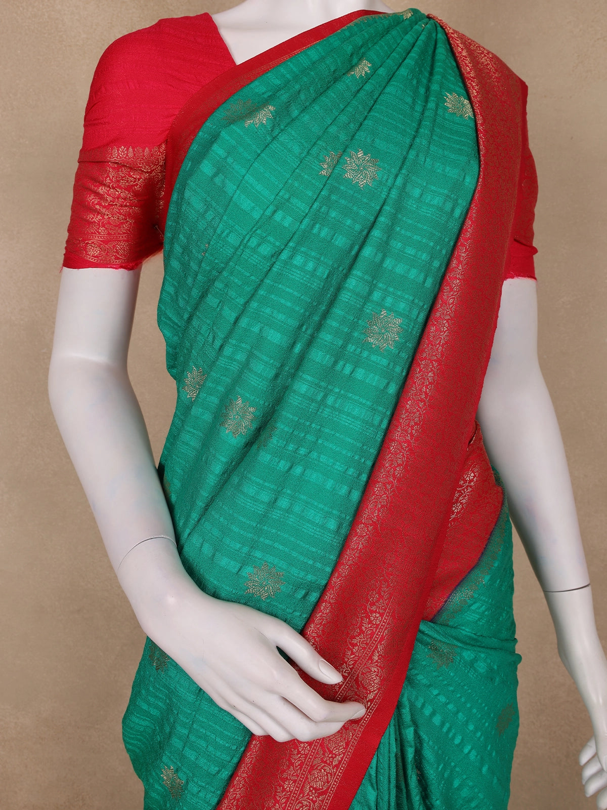 The saree is adorned with a classic woven butta design, showcasing the richness of traditional weaving techniques. Its contrast red pallu and blouse highlight the deep green body beautifully, creating a striking combination that embodies festive vibrance. The zari border, intricately woven with shimmering gold threads, adds an opulent finishing touch, elevating the saree’s regal appeal.
