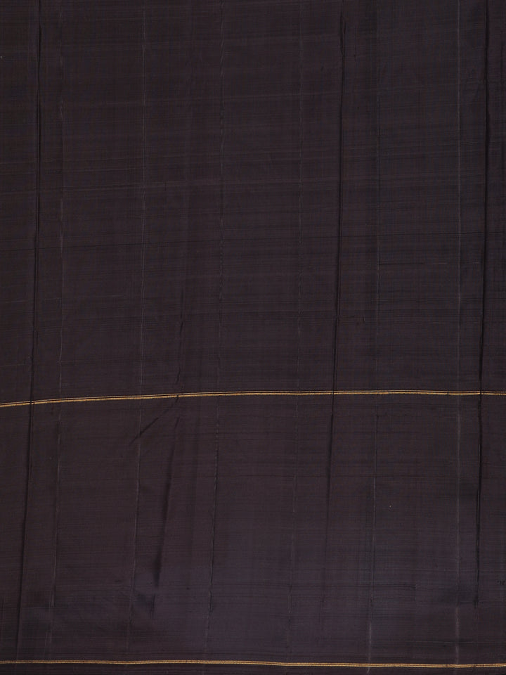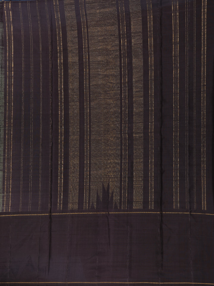 The contrast black blouse and pallu lend a bold and regal touch, beautifully enhancing the green body. A golden zari border frames the saree, adding grandeur and richness to the drape. Crafted with precision, the woven detailing highlights the unmatched artistry of Kanchipuram weaving.