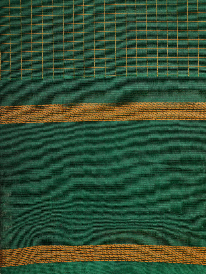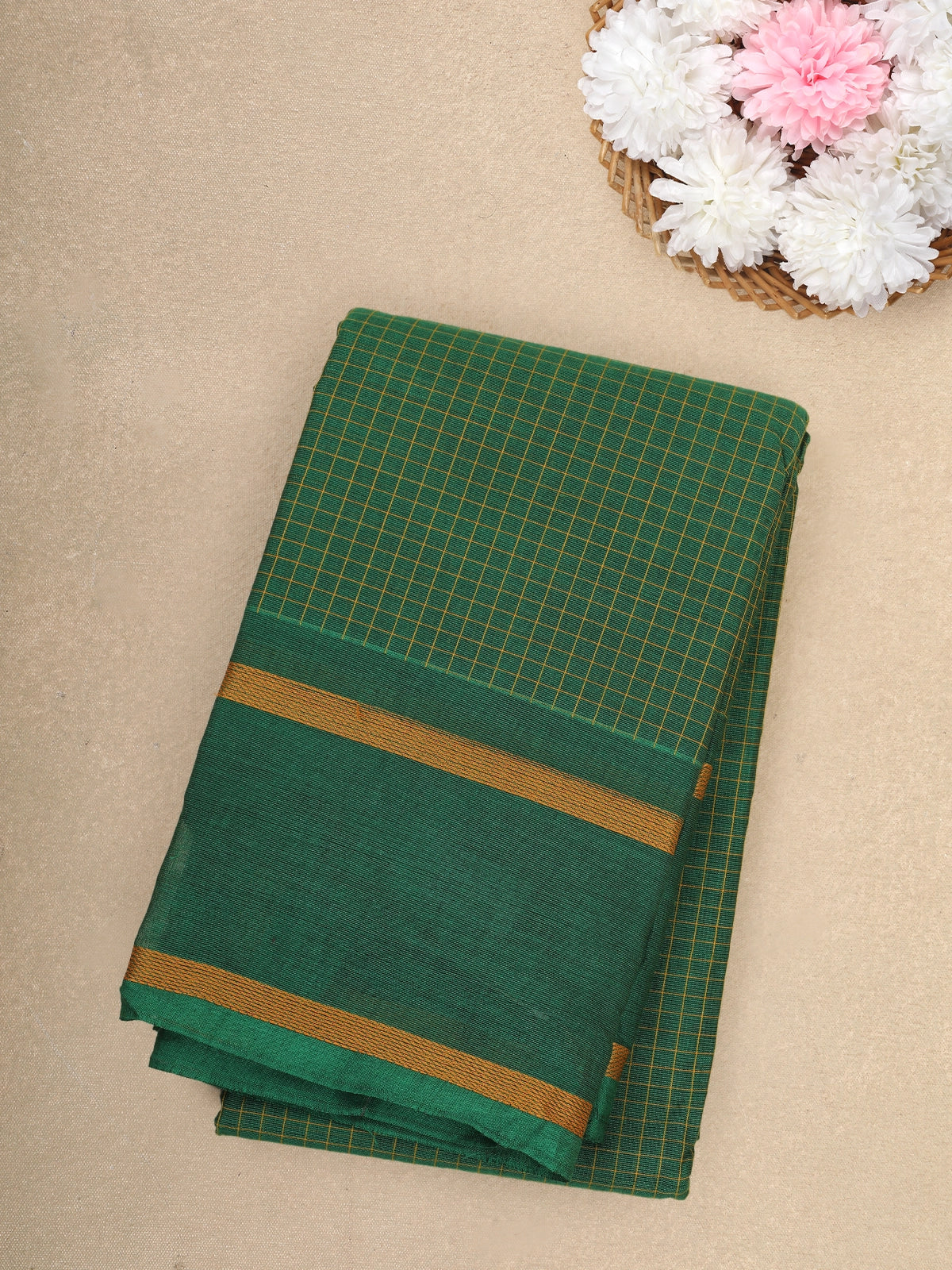 Green Checks Design Cotton Saree with Contrast Copper Zari Woven Border