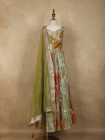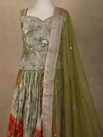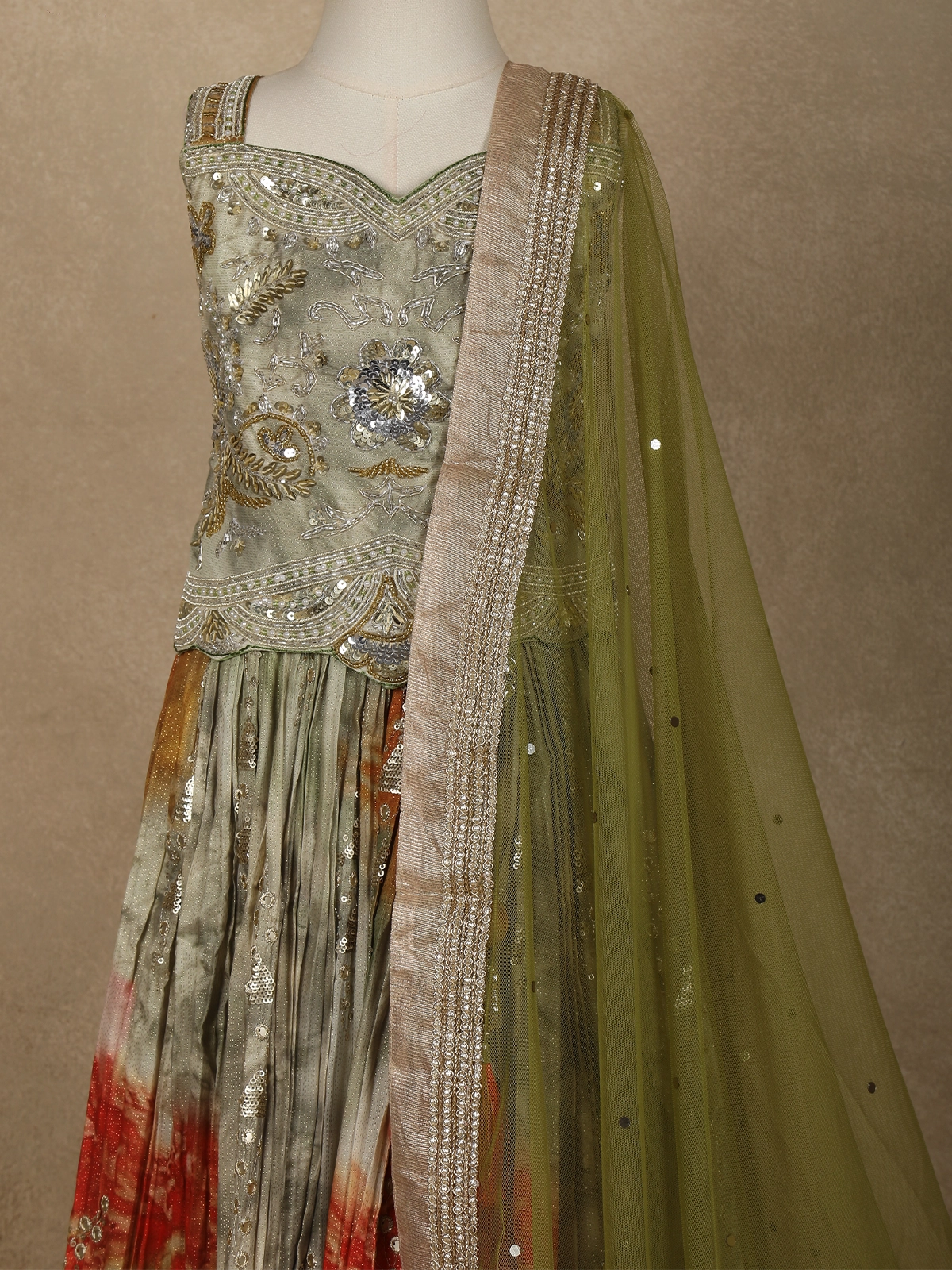 Green Floral Sequins Design Chiffon Kids Lehenga