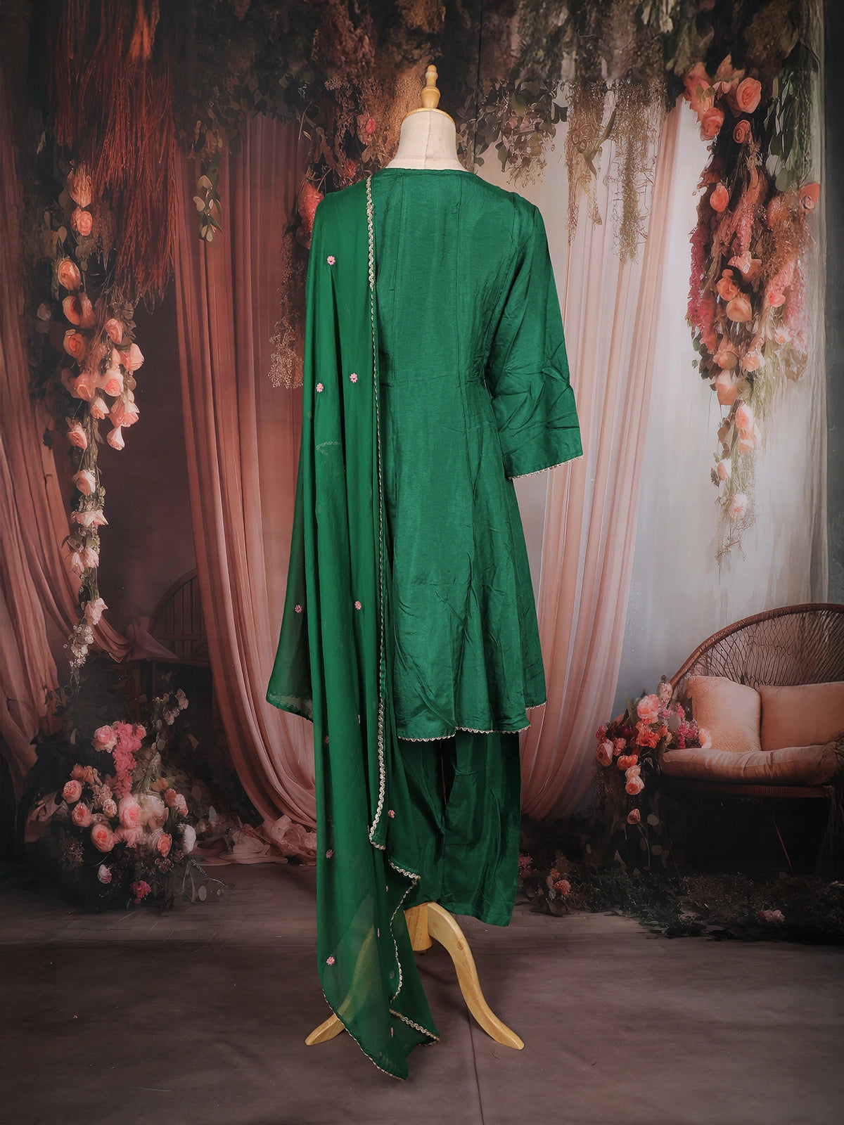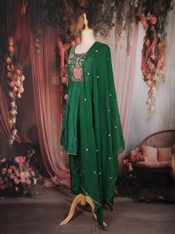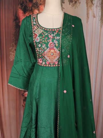 Perfect for festive occasions, traditional functions, family gatherings, and casual ethnic wear, this green Anarkali salwar suit is a versatile addition to your wardrobe—ideal for those who appreciate detailed embroidery, rich colours, and effortless grace.