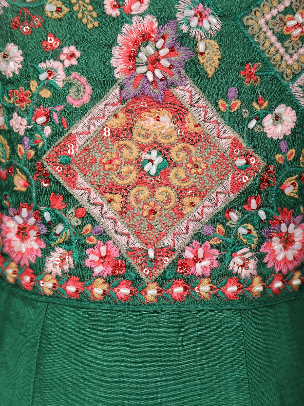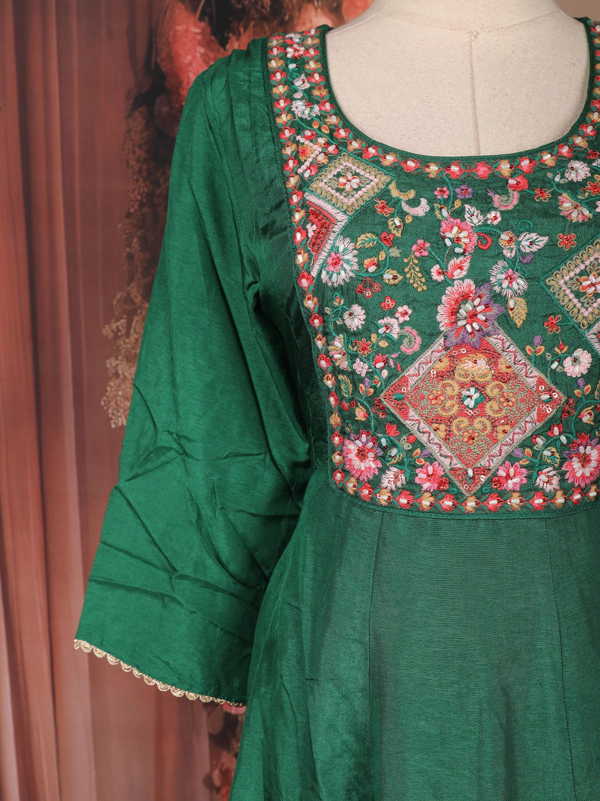 Embrace timeless ethnic elegance with this graceful green cotton Anarkali salwar suit, designed to blend comfort with refined craftsmanship. The Anarkali kurta features exquisite floral thread embroidery across the yoke, highlighted with delicate bead and sequin accents that add a subtle festive charm. The intricate multicolour embroidery stands out beautifully against the rich green base, giving the ensemble a classic yet vibrant appeal.