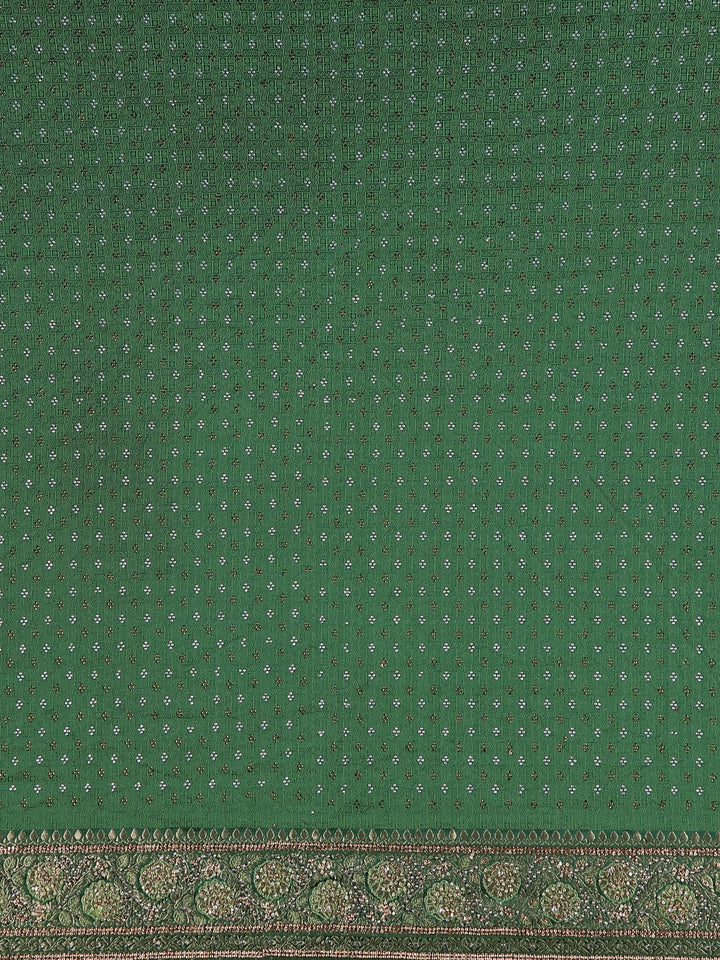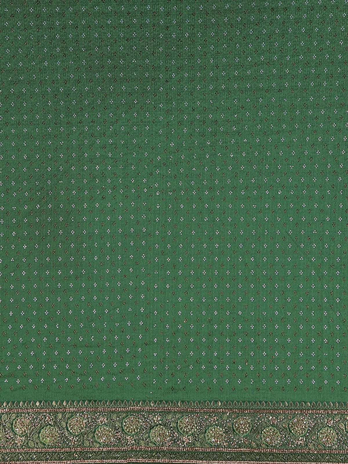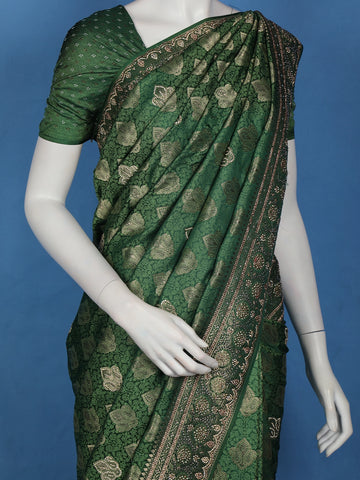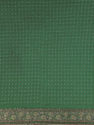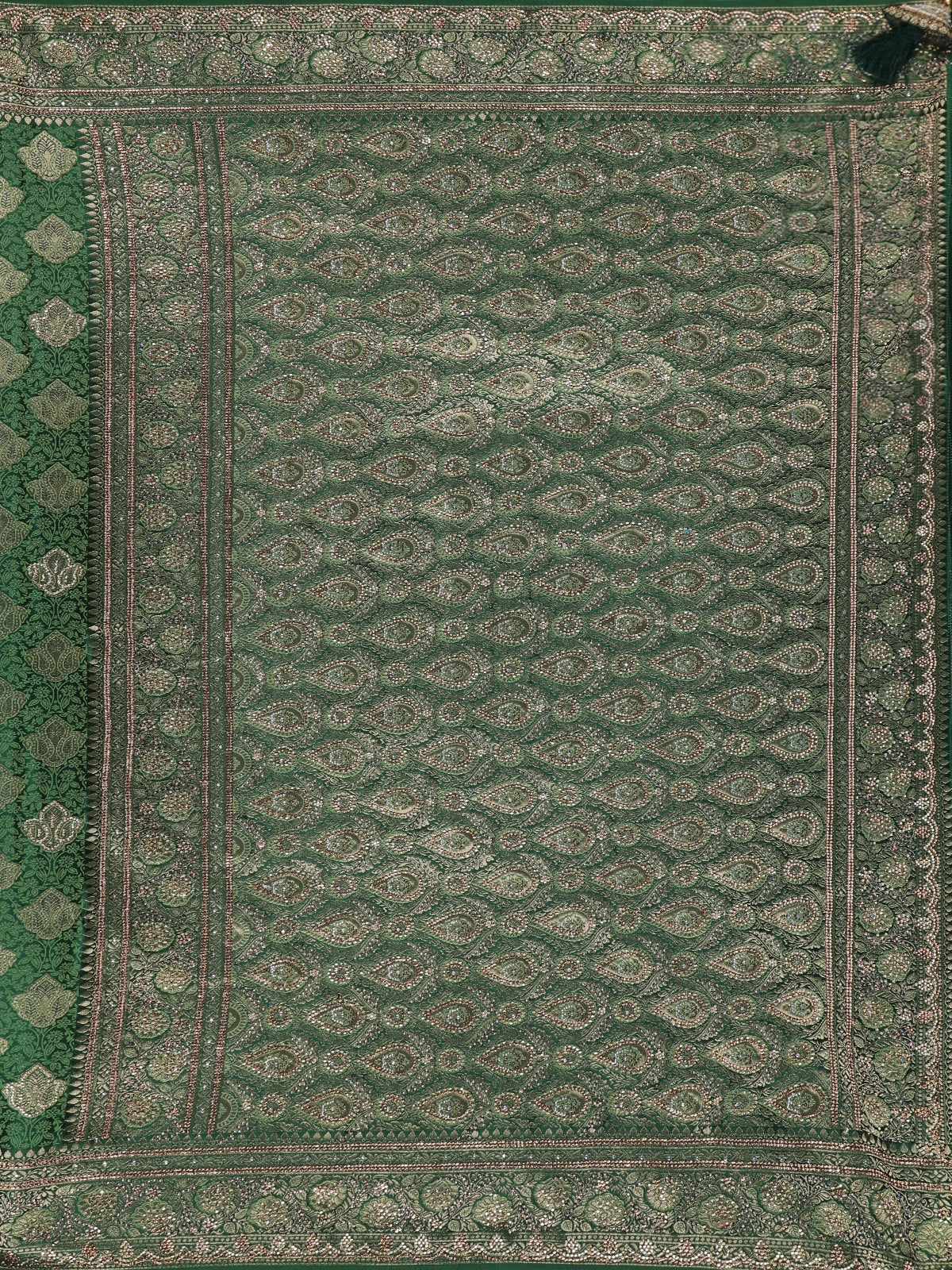 The saree comes with a matching green blouse enhanced with woven zari detailing, completing the coordinated and luxurious ensemble. Perfect for weddings, festive gatherings, and traditional celebrations, this saree radiates an ethereal charm that never goes out of style.