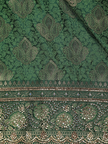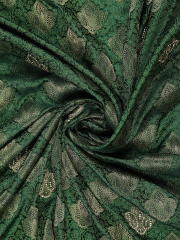 Grace your special occasions with the timeless allure of this Green Floral Woven Banarasi Silk Saree. Crafted with intricate zari floral motifs that bloom gracefully across the saree, it embodies the perfect blend of heritage craftsmanship and royal charm. The lustrous Banarasi silk drapes elegantly, while the designed zari border and matching pallu add a refined touch of sophistication.