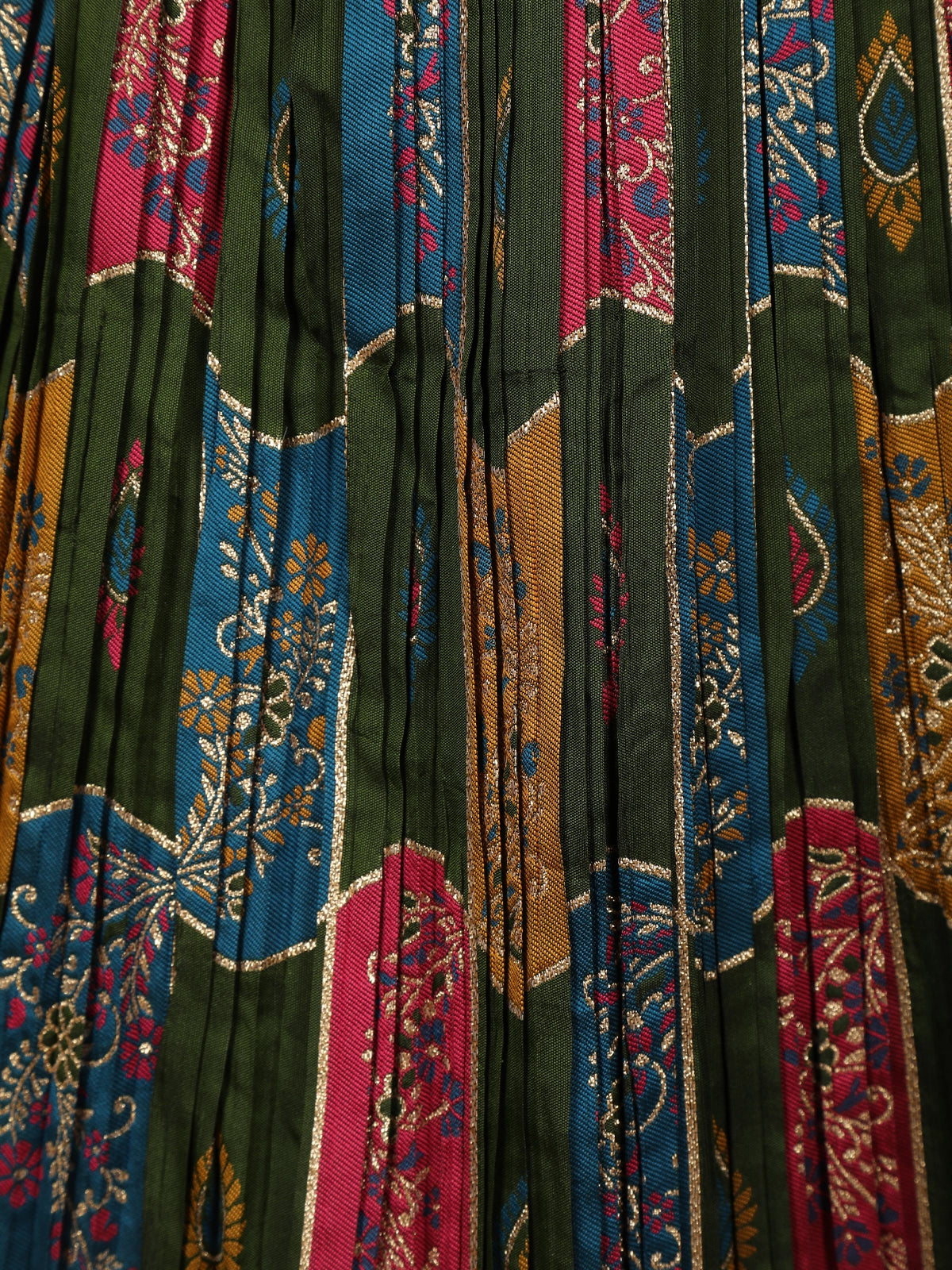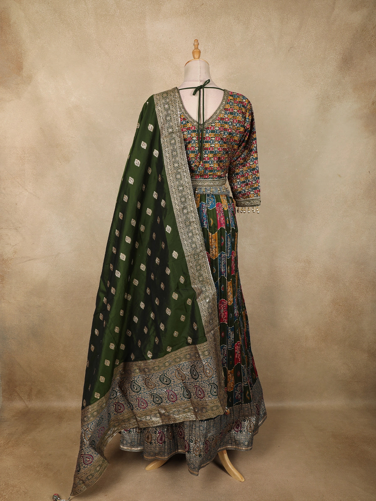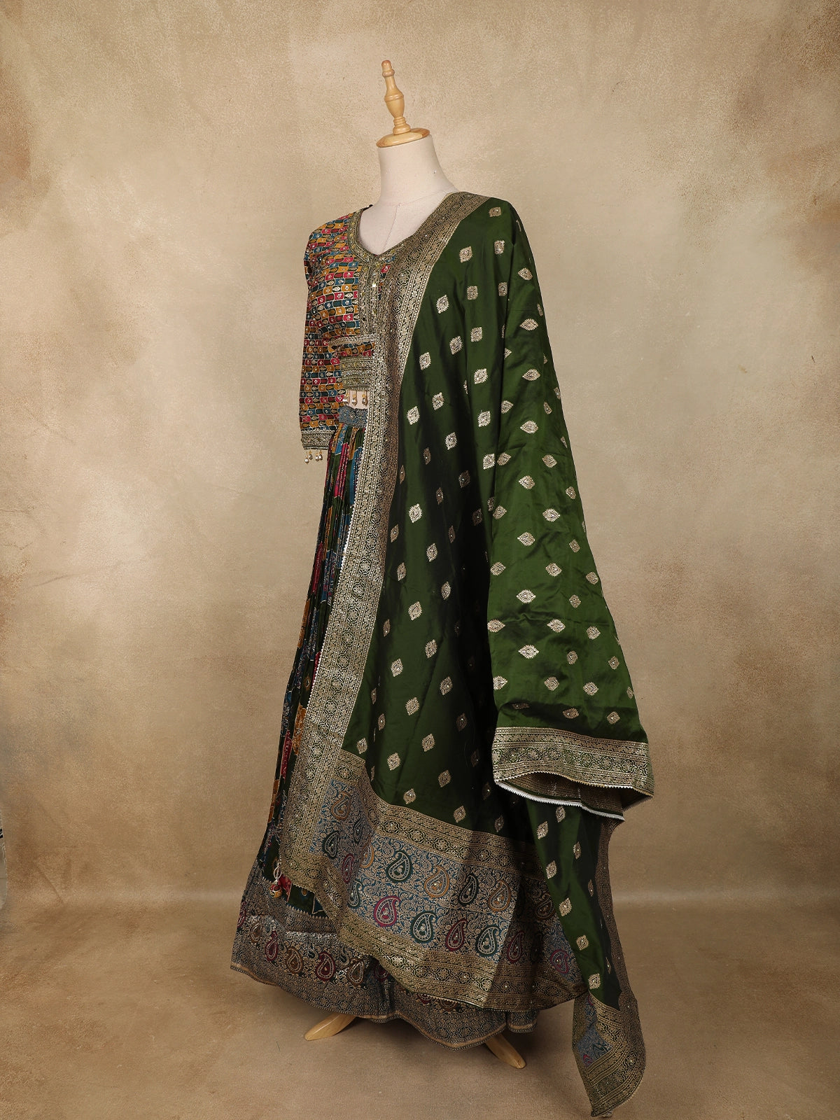 The lehenga skirt is designed in a rich green base, adorned with multicolor floral and ethnic-inspired prints that create a visually captivating appeal. The soft silk fabric lends a graceful fall and luxurious sheen, while the intricately finished paisley and zari-inspired hem border enhances the overall grandeur of the silhouette.