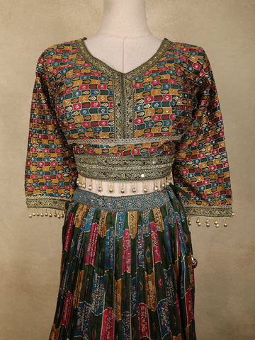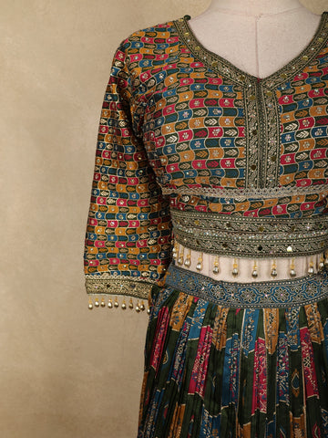 Celebrate timeless tradition with a vibrant touch in this green multicolor floral printed silk lehenga set, crafted to make a striking statement at festive and celebratory occasions. The ensemble beautifully blends classic ethnic artistry with lively hues, making it a perfect choice for parties and traditional gatherings.