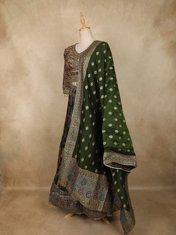 Paired with the set is a matching green dupatta, beautifully highlighted with all-over butta motifs and an ornate woven border. Its elegant drape adds fluidity and completes the traditional look with refined sophistication.