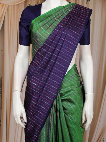 A perfect harmony of tradition and sophistication, this Green Pure Kanchipuram Silk Saree is a testament to timeless South Indian craftsmanship. The saree showcases a refined striped zari-woven pattern across the body, exuding understated grace and a subtle shimmer with every movement.
