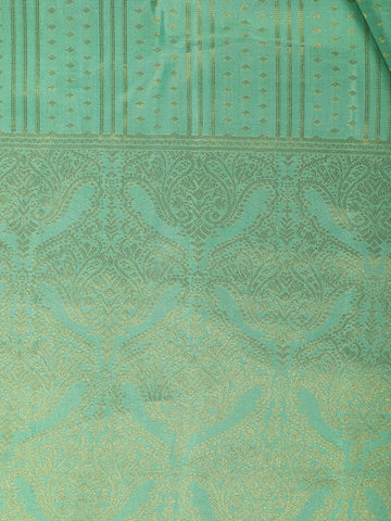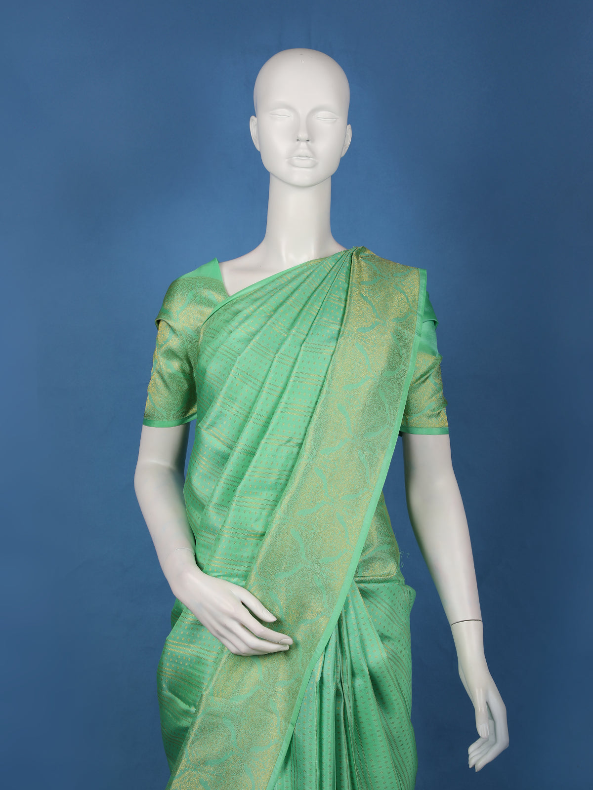 Paired with a matching green blouse detailed with zari accents, this saree is an exquisite choice for weddings, festive rituals, and cultural celebrations. Its refreshing green hue combined with intricate woven detailing makes it a radiant addition to any ethnic wardrobe, embodying both tradition and refinement.