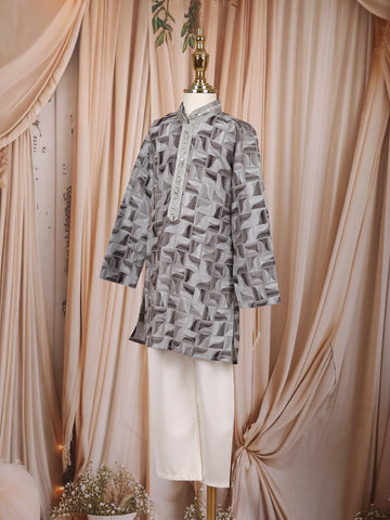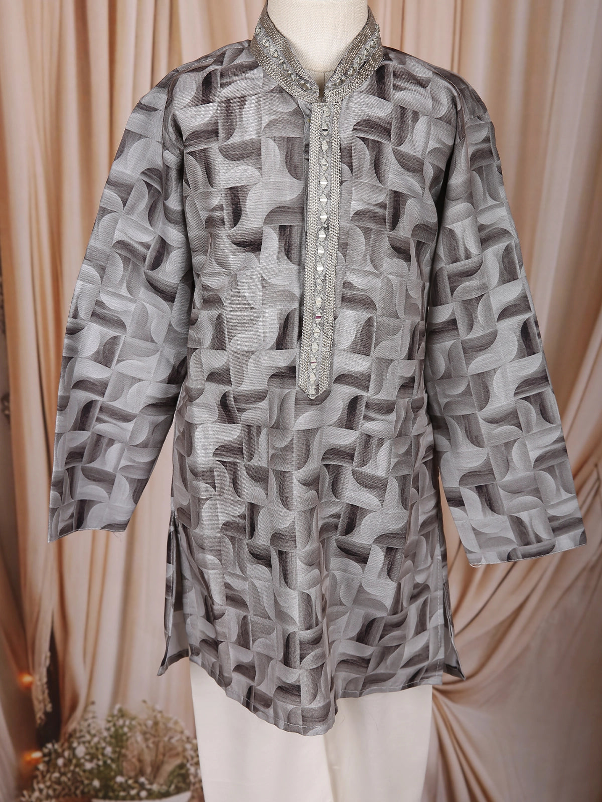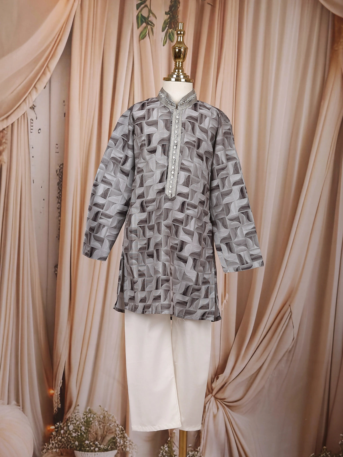 Dress your little champ in style with this Grey Abstract Woven Design Kurta Set, an elegant pick fused with modern ethnic charm. The subtle yet eye-catching geometric abstract motifs add a fresh twist to the traditional kurta silhouette, making it perfect for festive and special occasions.