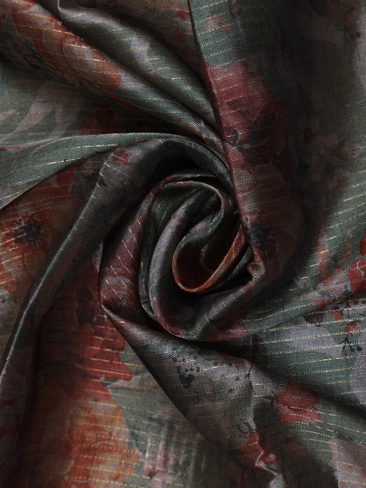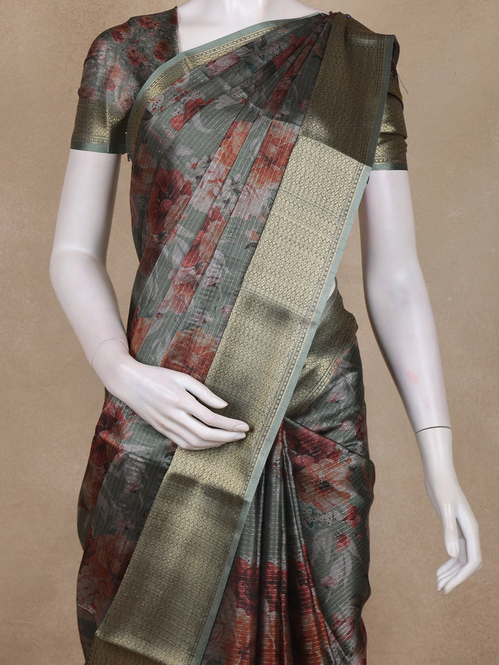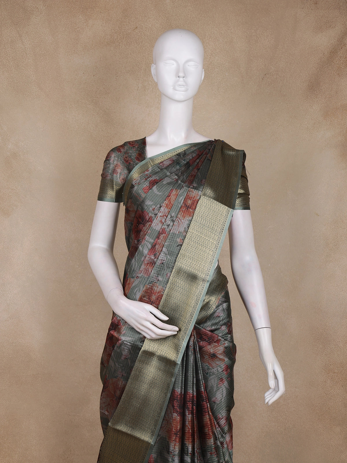 Drape yourself in timeless charm with this Grey and Maroon Floral Printed Mixed Cotton Fancy Saree, a perfect blend of traditional artistry and modern grace. The saree features a sophisticated grey base adorned with rich maroon floral prints, evoking a sense of understated luxury. The design is elevated by a lustrous olive-green zari border, lending a regal touch to the contemporary floral patterns.