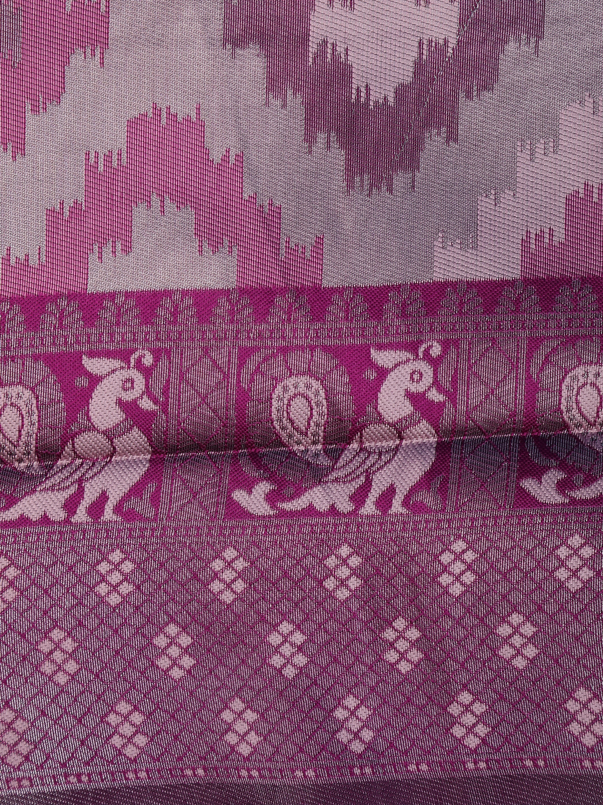Channel timeless sophistication with this Grey and Pink Art Silk Saree, intricately woven in a classic Ikat pattern that reflects exquisite craftsmanship. The subtle grey base is adorned with soft pink geometric motifs, while the contrast magenta zari border featuring peacock motifs adds a luxurious traditional charm. The lustrous finish of the art silk enhances its festive elegance, making it a statement piece for every celebration.