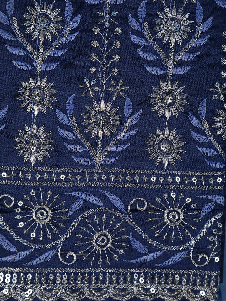 The saree is paired with a contrast navy blue embroidered blouse, beautifully detailed with silver and blue floral motifs accentuated by sequins. The perfect fusion of subtle grace and festive shimmer, this saree is ideal for weddings, receptions, and cultural festivities.