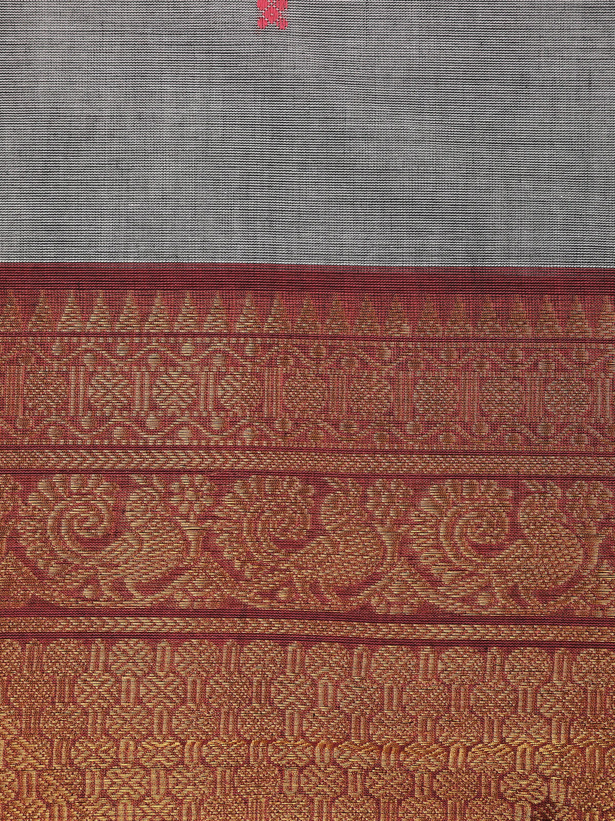 Understated yet regal, this Grey Butta Woven Cotton Saree embodies traditional elegance with modern simplicity. The soft grey base is adorned with subtle woven butta motifs, offering a refined and graceful look. Its contrast maroon pallu paired with a rich golden zari border featuring intricate floral and geometric patterns enhances the saree’s grandeur, making it perfect for both casual gatherings and festive occasions.