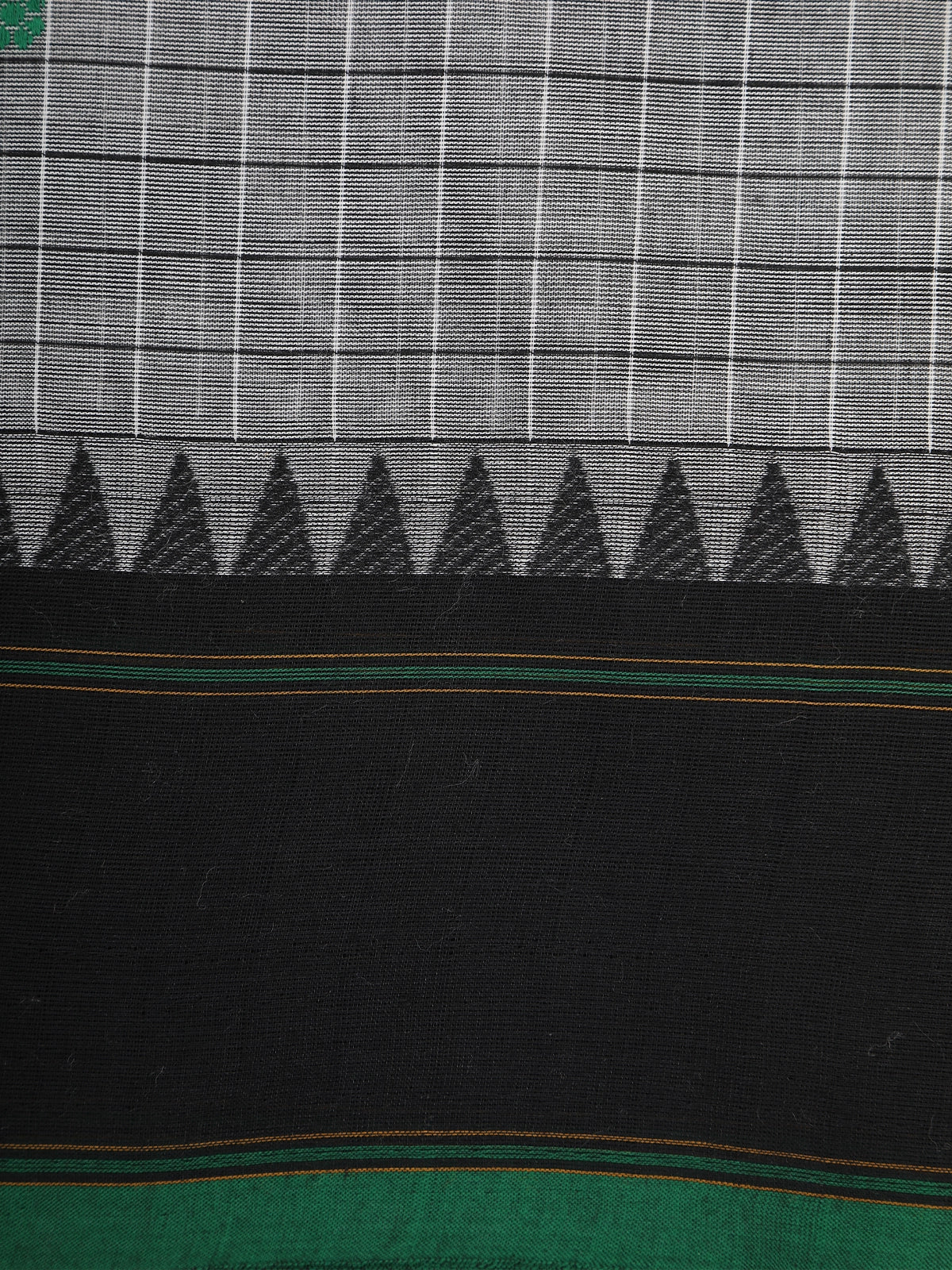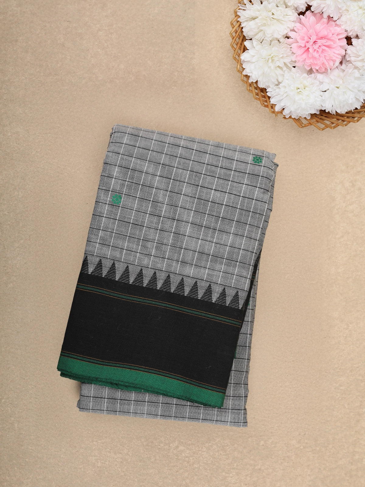 Embrace classic elegance with this beautifully woven Grey Checked Cotton Saree, perfect for everyday grace and traditional charm. The subtle check pattern gives a neat, tailored look, while the small green buttis scattered across the body bring just the right amount of detail and liveliness to the drape.