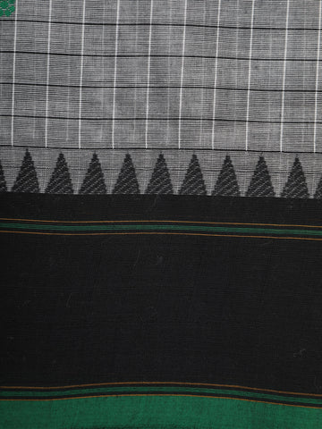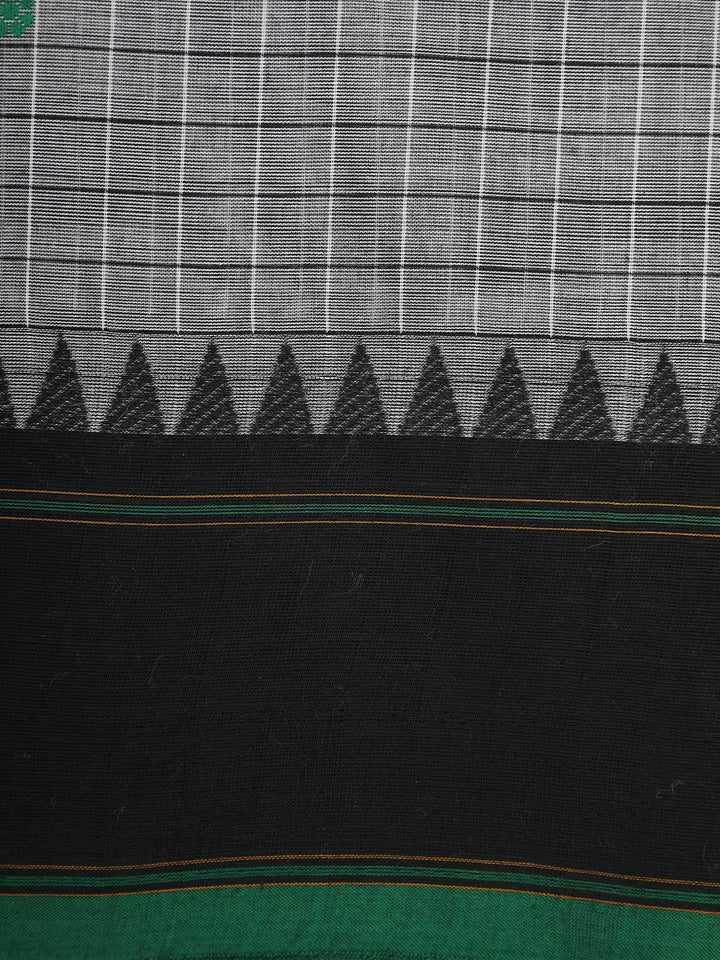 The standout feature is the bold black temple border accentuated with hints of deep green, giving the saree a dignified and ethnic finish. Crafted from breathable cotton, it promises comfort throughout long hours — whether you’re at work, attending a casual gathering, or making a serene temple visit.